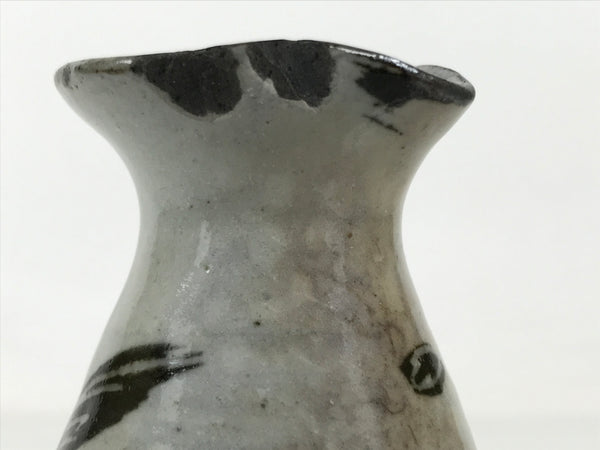 This is a Japanese vintage ceramic sake bottle, or Tokkuri. It features shades of gray, a light gray base with a dark gray design around the bottom, on the body, and the rim. The body has some indentations, making it easy to hold the bottle. The rim is wavy, and a wave makes a spout.  Its compact size makes it easy to use daily for beverages or as a small flower vase.