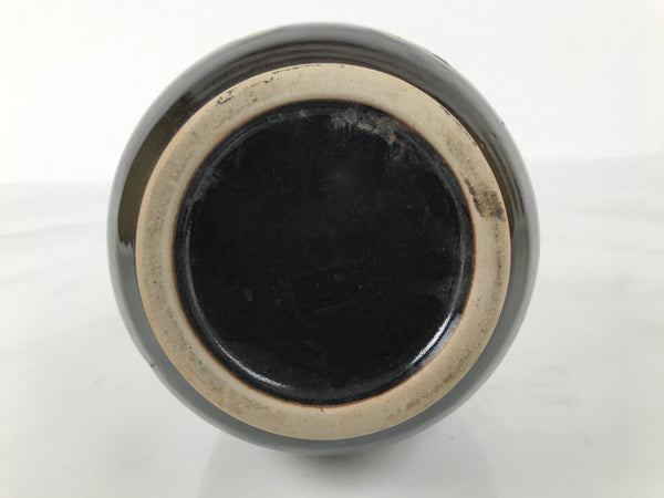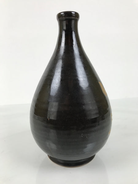 This is a vintage Japanese ceramic sake bottle. It is called a Kayoi-Tokkuri and is used to pour sake. The commuting sake bottle became popular as a rental container for liquor stores in the Edo period when sake began to be consumed daily. It is covered with brown glaze, and the unglazed parts make some characters related to Sake. The body is round, and the neck is long and thin.