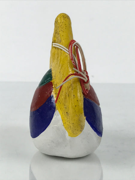 This is a vintage Japanese clay bell, Dorei or Tsuchi-Suzu. This dorei is in the shape of a houshu no tama, a pear-like emblem with small flames, a common symbolic feature in inari shrines across Japan. This item is carried by fox spirits and said to grant wishes. It is painted yellow, red, green, and blue with gold glitter on the flame section. There is a small brown clay ball inside as well as a red and white string tied at the top.