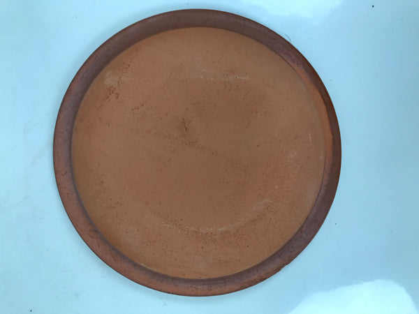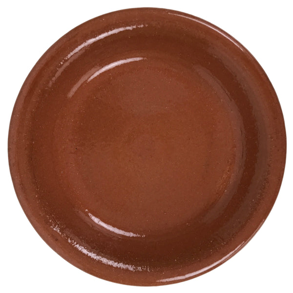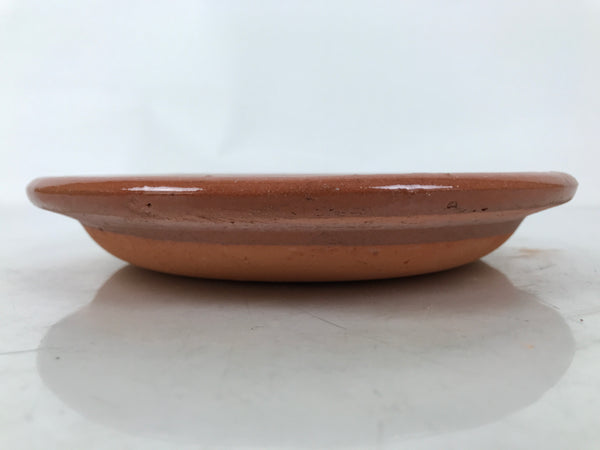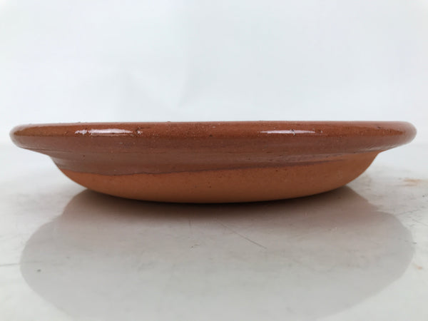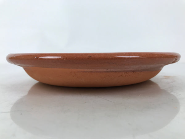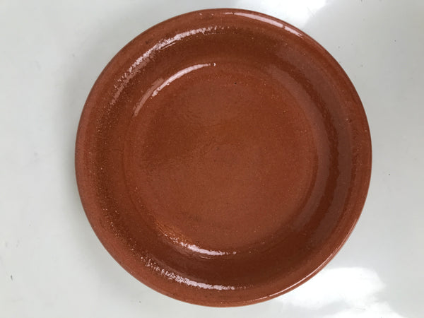 This is a vintage Japanese terracotta plate. It is a medium size with lifted edges so it can double as a pasta or salad plate. It is made of red clay and has a clear glaze over the front side with an unglazed bottom.