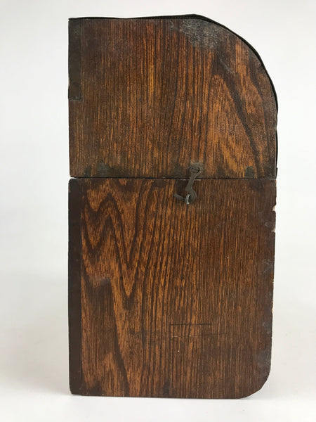 This is an antique Japanese fly and mosquito trap from the early 1900s. It operates by a key-wound clockwork mechanism. To operate one would put a mixture of molasses and vinegar on the rotating barrel. As the barrel turns, the flies would be attracted to the sticky barrel. As the barrel would rotate, the flies would get scraped off and into the cage of the screen.