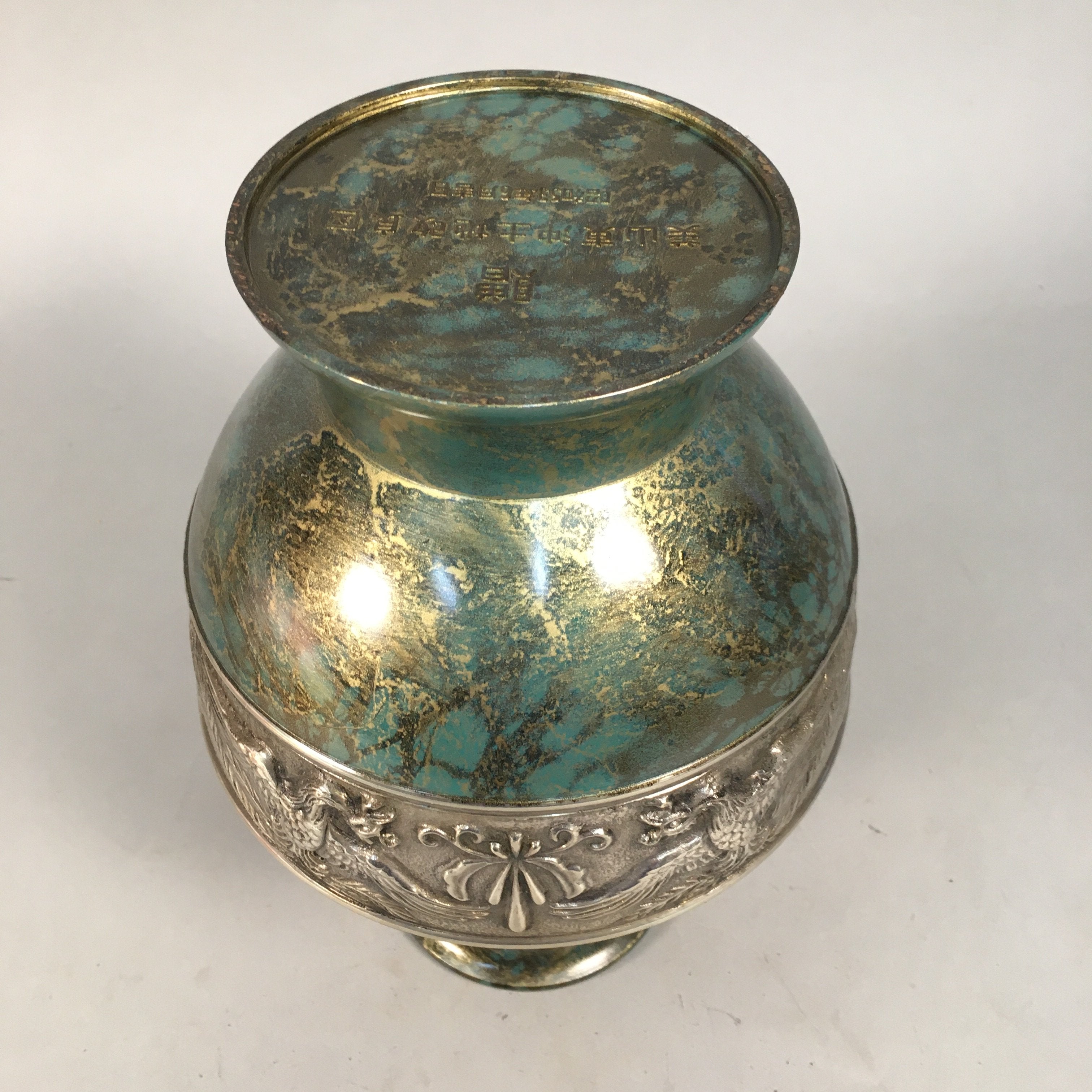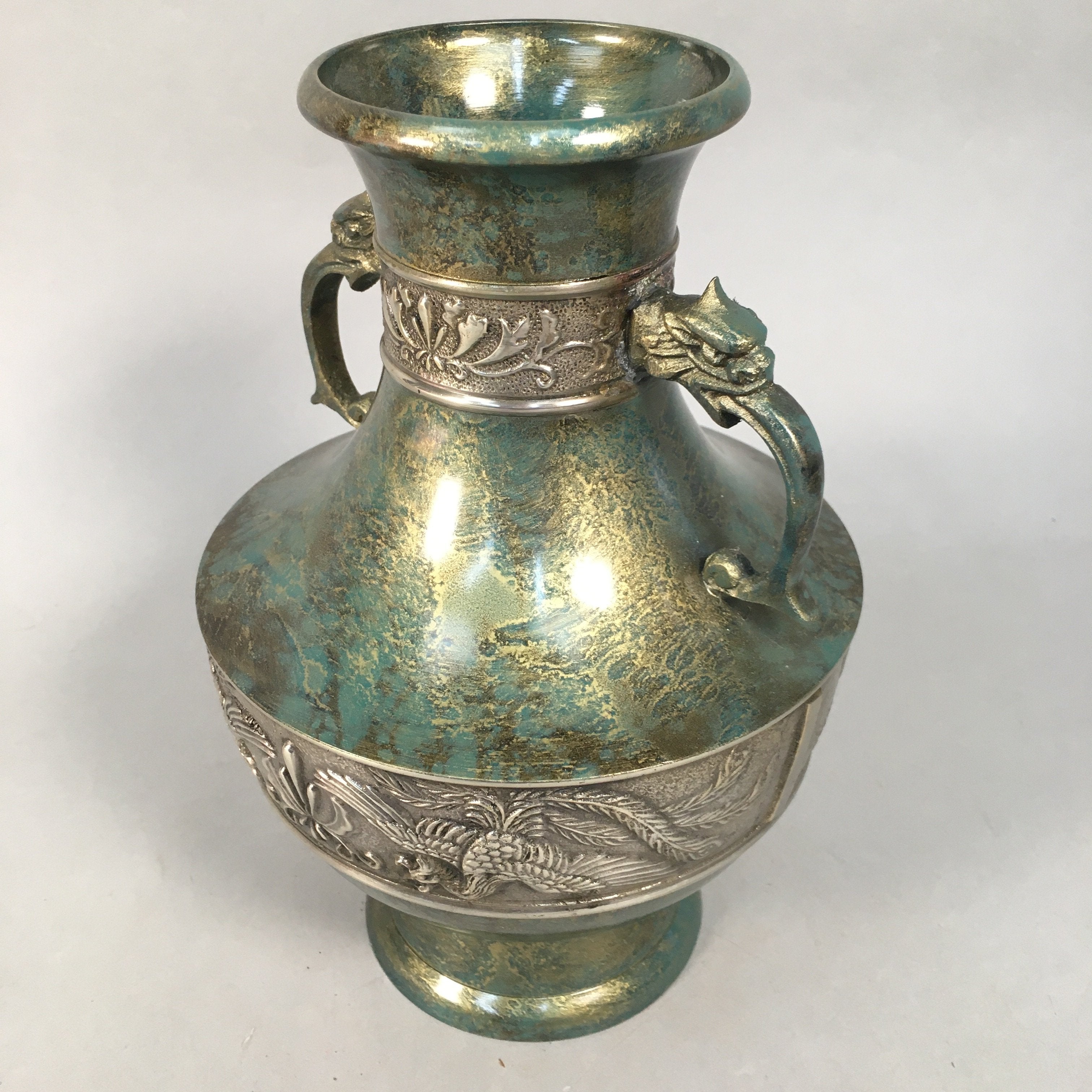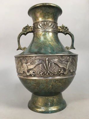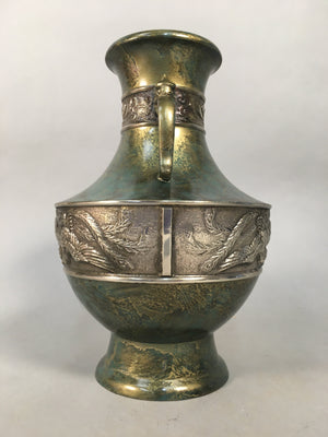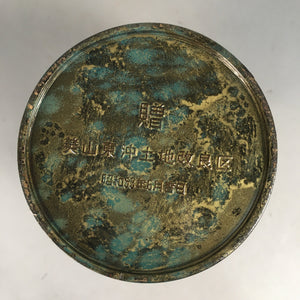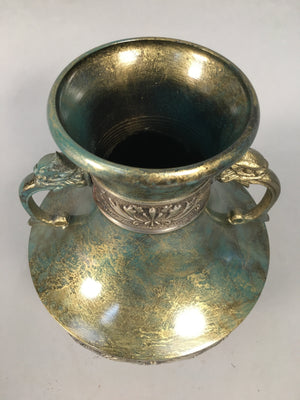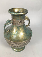 Japanese Bronze Flower Vase Vtg Cast Metal Kabin Ikebana Green Gold Shishi FV894