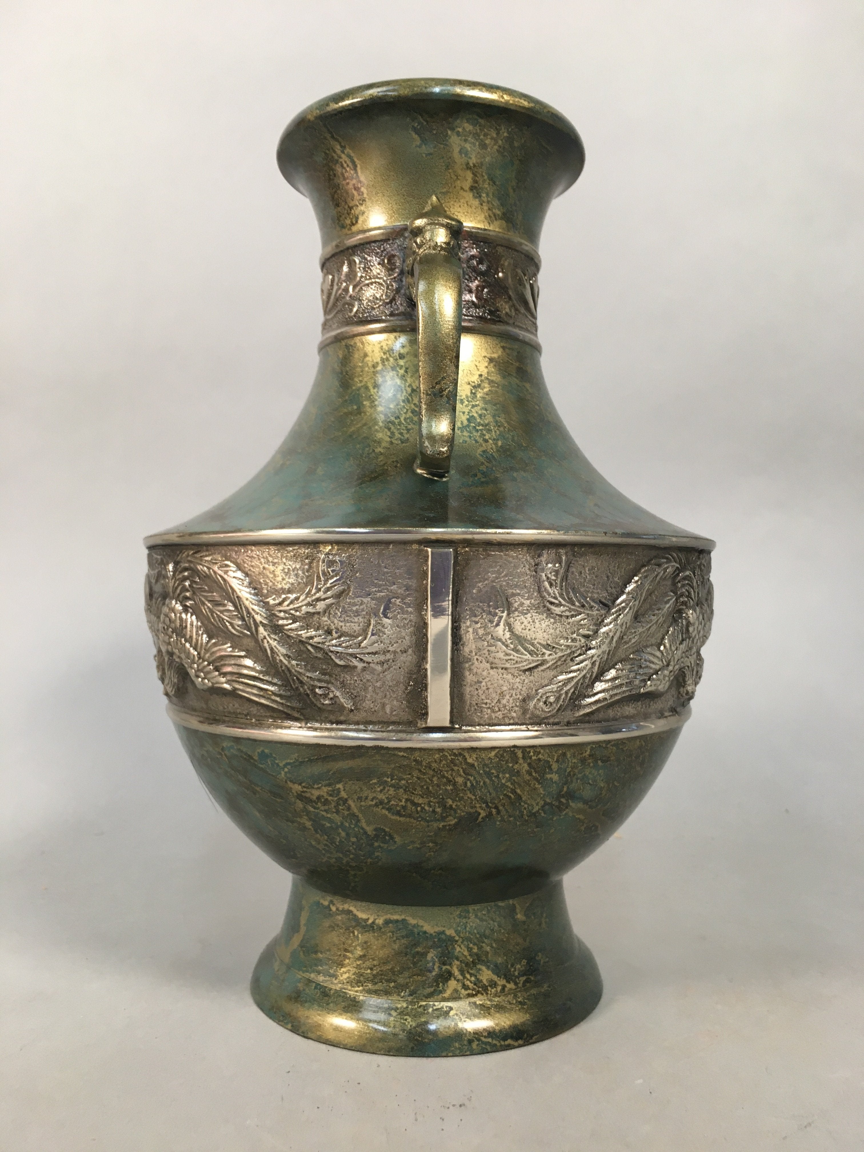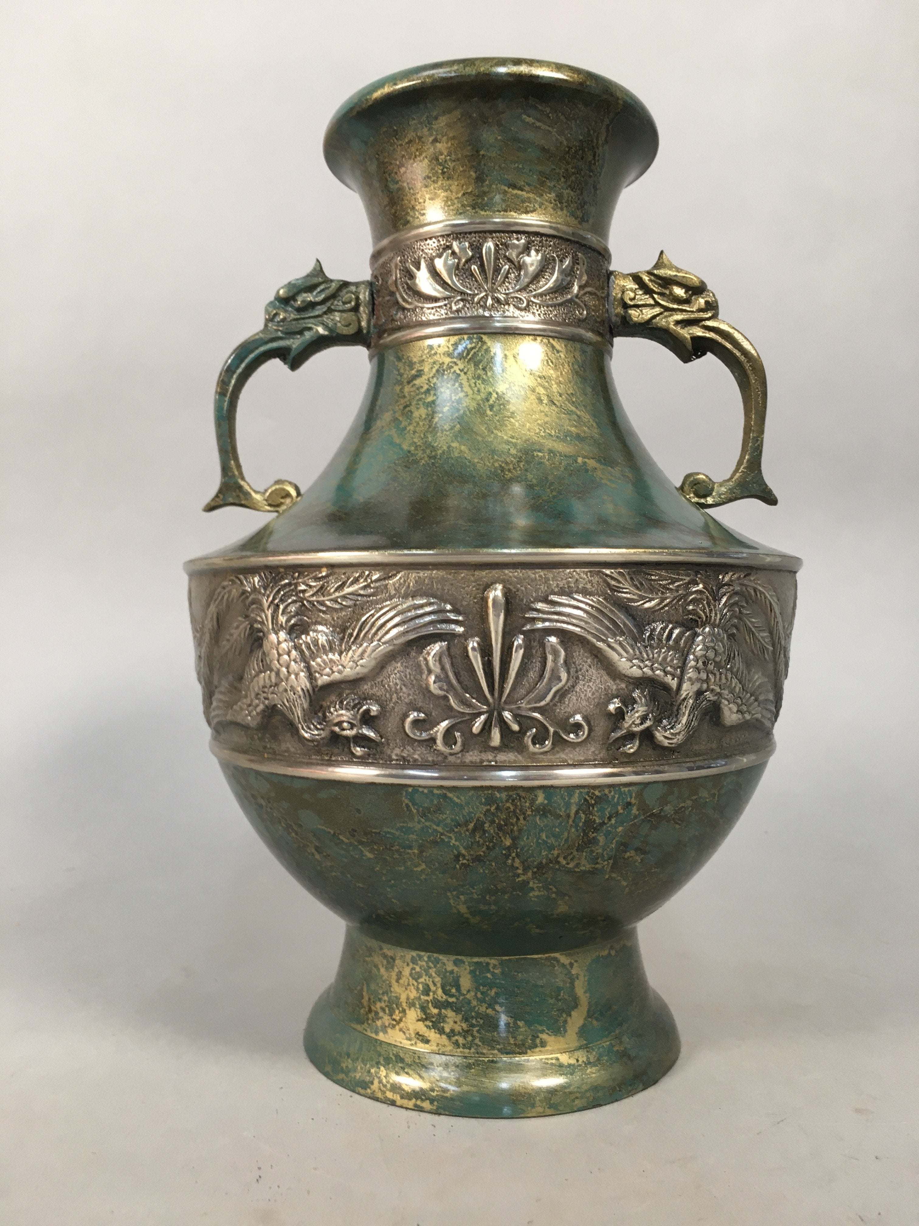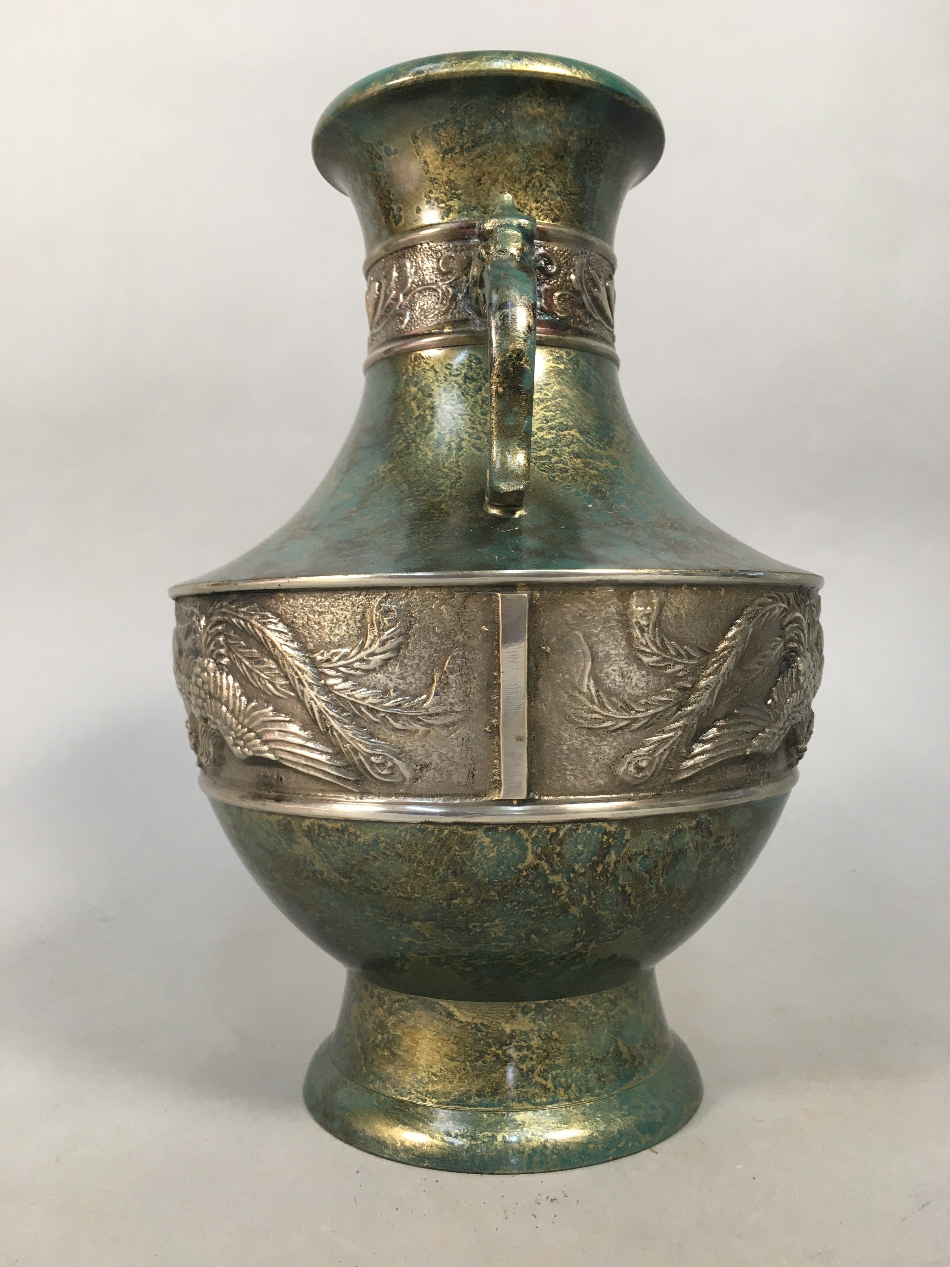 Japanese Bronze Flower Vase Vtg Cast Metal Kabin Ikebana Green Gold Shishi FV894