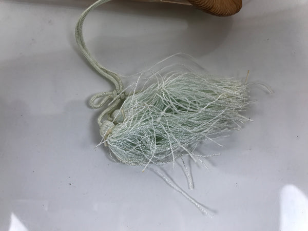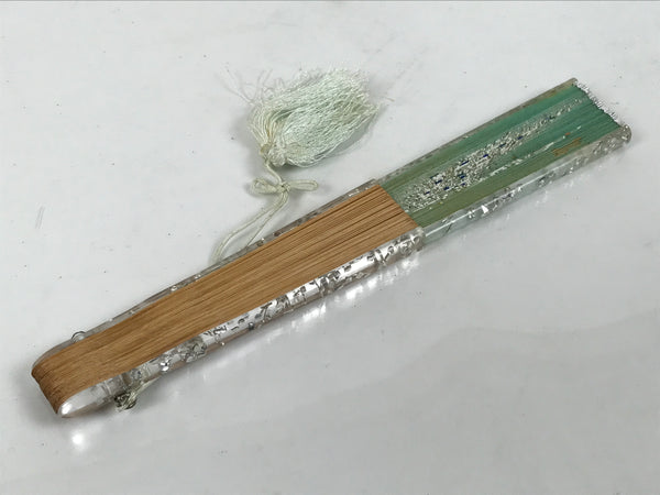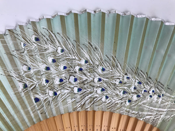 This is a traditional Japanese folding fan called sensu. You can use this when it's hot or as decoration. This decorative fan is made with a sheer mint-green fabric that features a white and blue peacock. The frame is a combination of natural bamboo and resin. There is a mint-green string with tassels attached to the bottom.