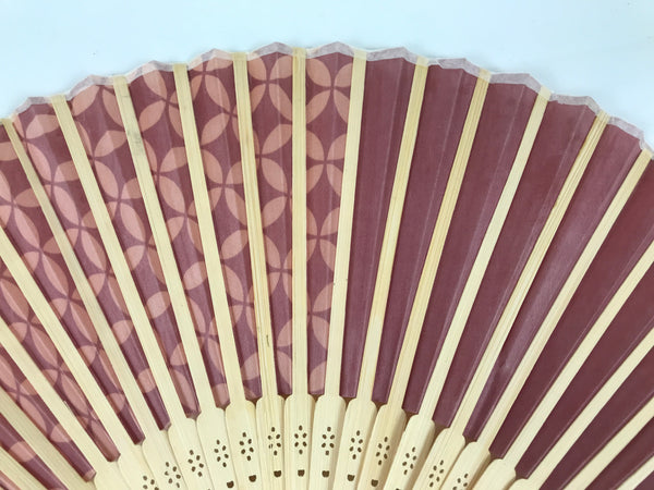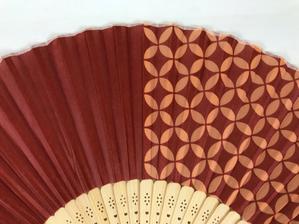 This is a traditional Japanese folding fan called sensu. You can use this when it's hot or as decoration. This decorative fan is made with a sheer red fabric that features half solid red and half a traditional Japanese pattern called Shippo. The frame is natural bamboo with decorative cutouts.