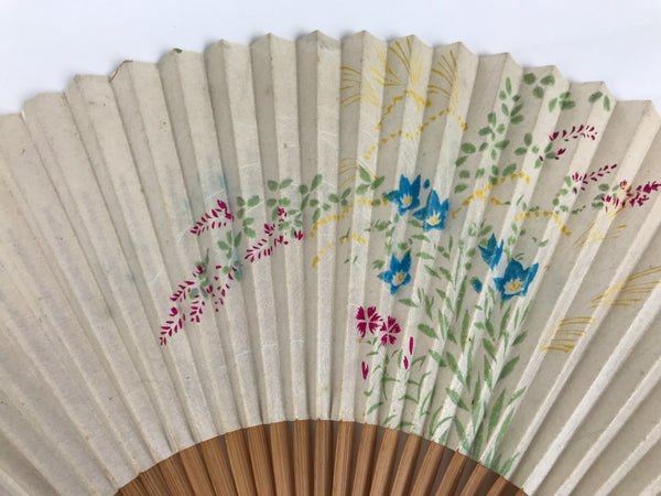 This is a traditional Japanese folding fan called sensu. You can use this when it's hot or as decoration. This fan is made of natural bamboo and a thick, durable paper. It features a floral composition including kikyo bellflowers, Japanese nadeshiko carnation flowers, fuji wisteria flowers, and Japanese susuki silver grass.
