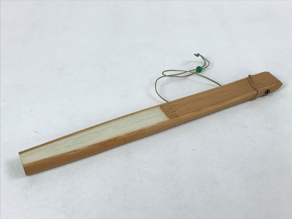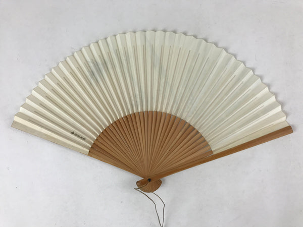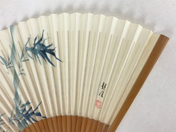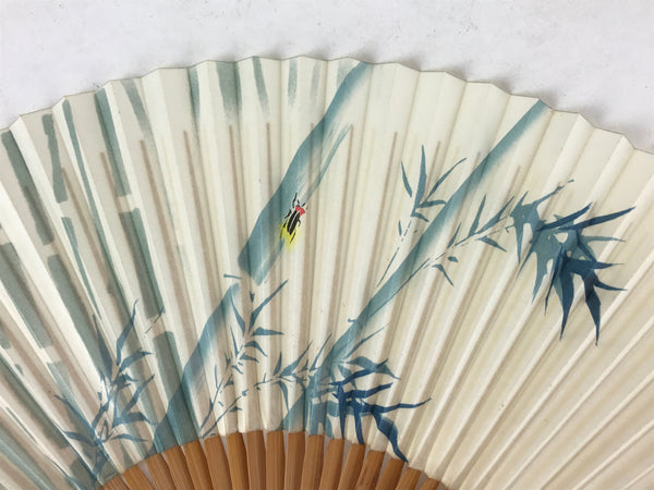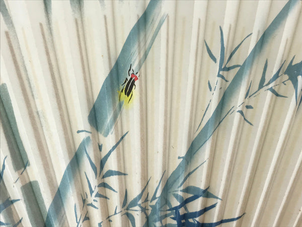 This is a traditional Japanese folding fan called sensu. You can use this when it's hot or as decoration. This decorative fan has a single firefly resting on the side of a stalk of bamboo. The back is blank and there is a gray string with a green bead attached to the bottom. The frame is natural bamboo. There is a red seal on the front side.