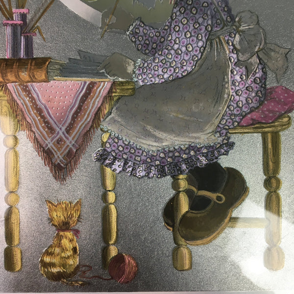 Japanese Framed Metallic Foil Art Print Vtg Girl Cat Silver Blue J824