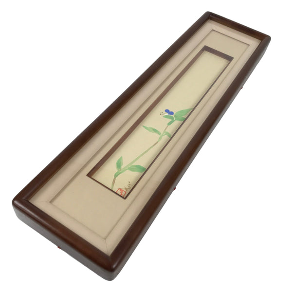 This is a vintage Japanese framed Tanzaku. A Tanzaku is a long and narrow Shikishi used for painting and writing Japanese poems such as Haiku or Tanka. The Tanzaku features a delicate painting of a flower called tsuyukusa in Japanese (dayflower). The artwork is signed with a name and a red seal. The frame is made of wood, glass, and other material. There is a string at the back to hang the item up. This item comes in a box.