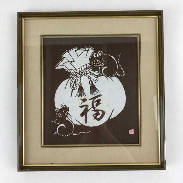 In a brown and gold plastic frame, this katagami textile stencil made of mulberry paper displays the image of two rats around a pouch labeled "fortune". These two themes together mean this image is zodiac and New Year-related.