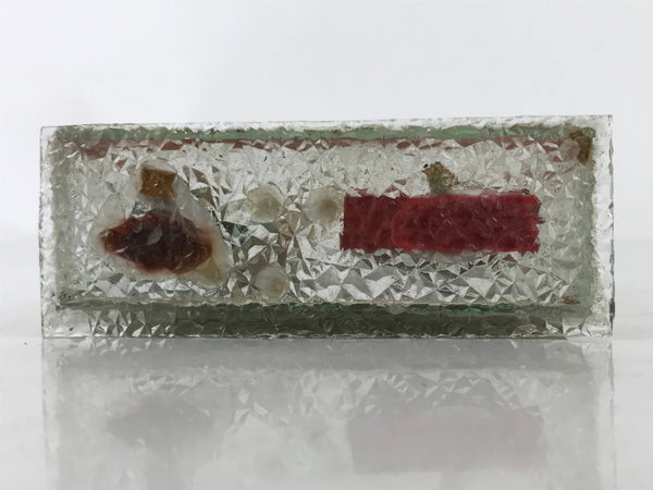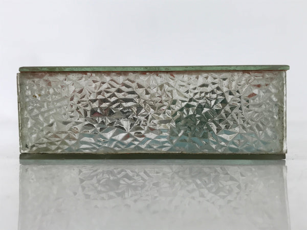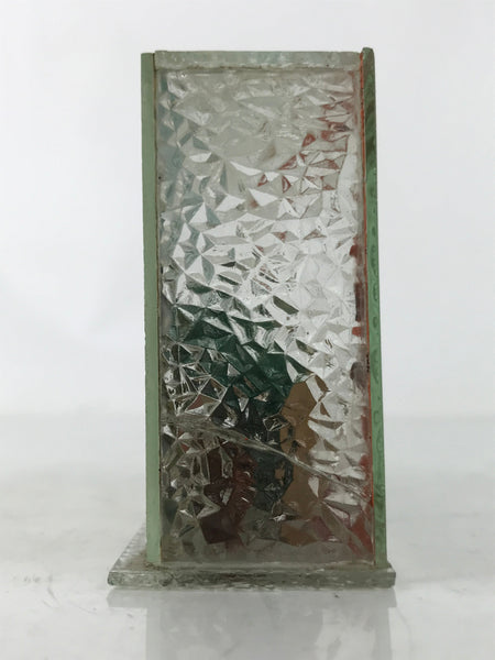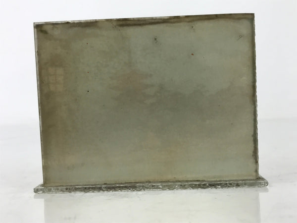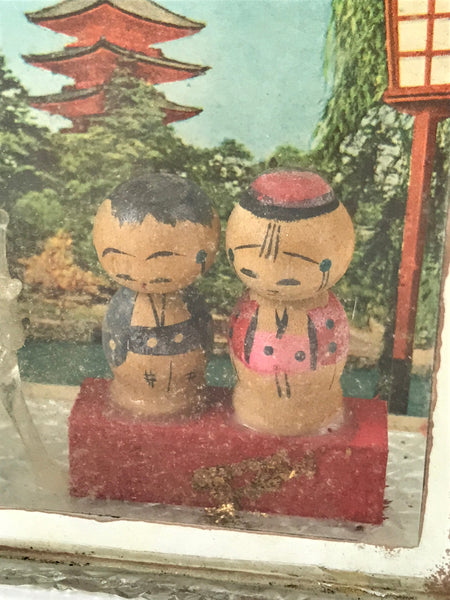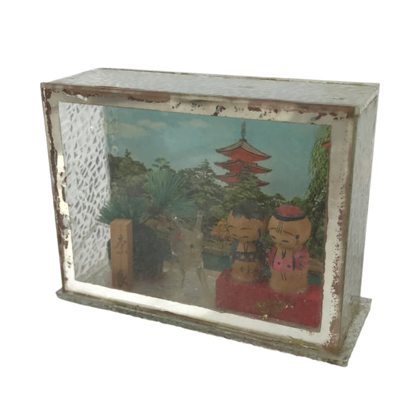This vintage Japanese glass display case features a deer, a matsu pine tree, a couple in Kimono, a pagoda, and a lantern. This item is a souvenir from Nara, famous for its temples and deer. The orange-spotted transparent deer is made of glass, it is called garasu zaiku in Japanese. The figurines are displayed in a glass case, which you cannot open. The front panel is transparent, and the back panel has a printed pagoda and lantern.