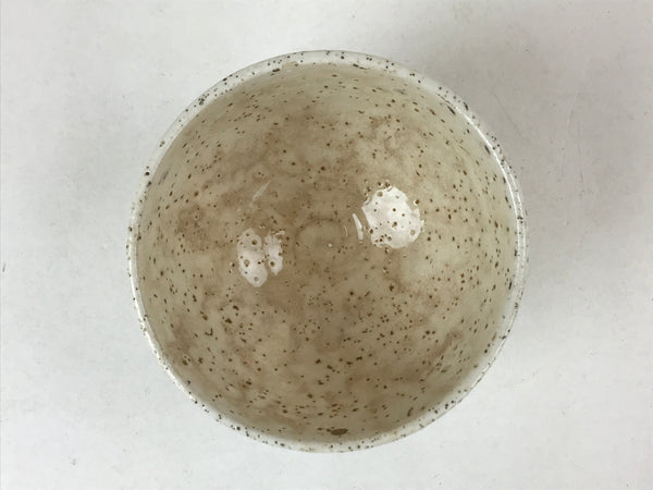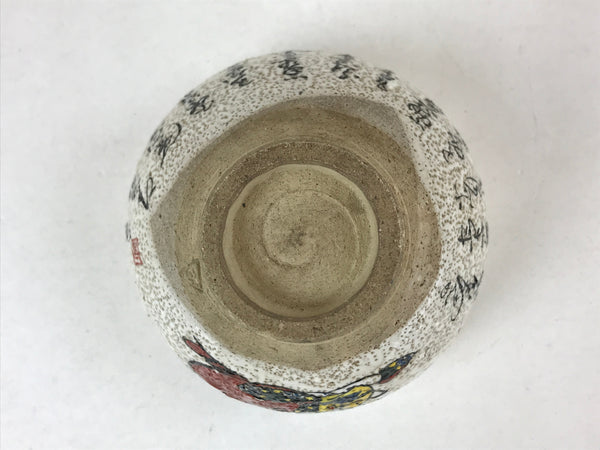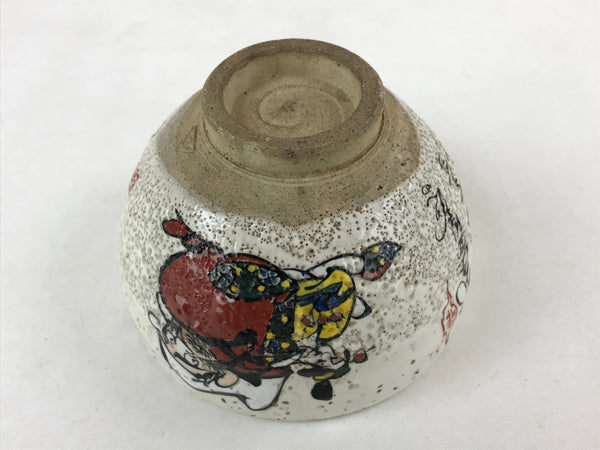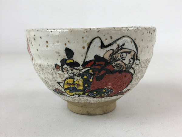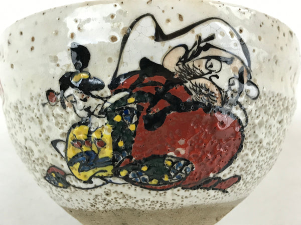 This is a vintage Japanese ceramic green tea bowl, Matcha Chawan. It has a light color base with an illustration and some text on top. The illustration represents a man and a woman wearing kimonos. The text is black and is long enough to cover one side of the bowl. This bowl is signed on the bottom. It is sturdy and easy to handle. Green tea bowls are traditionally used for preparing and drinking green tea during tea ceremonies but can be used in many scenes of modern everyday life.