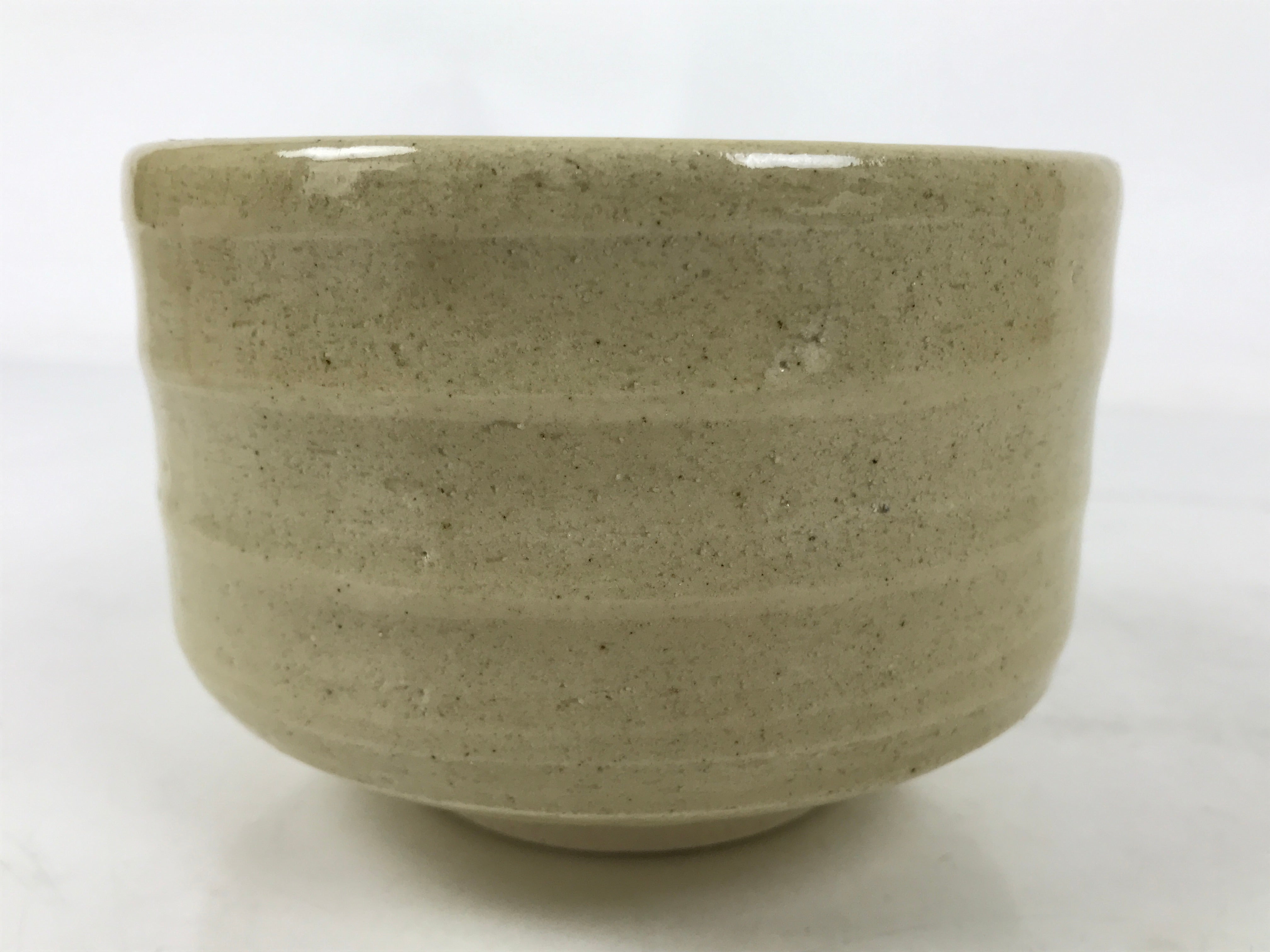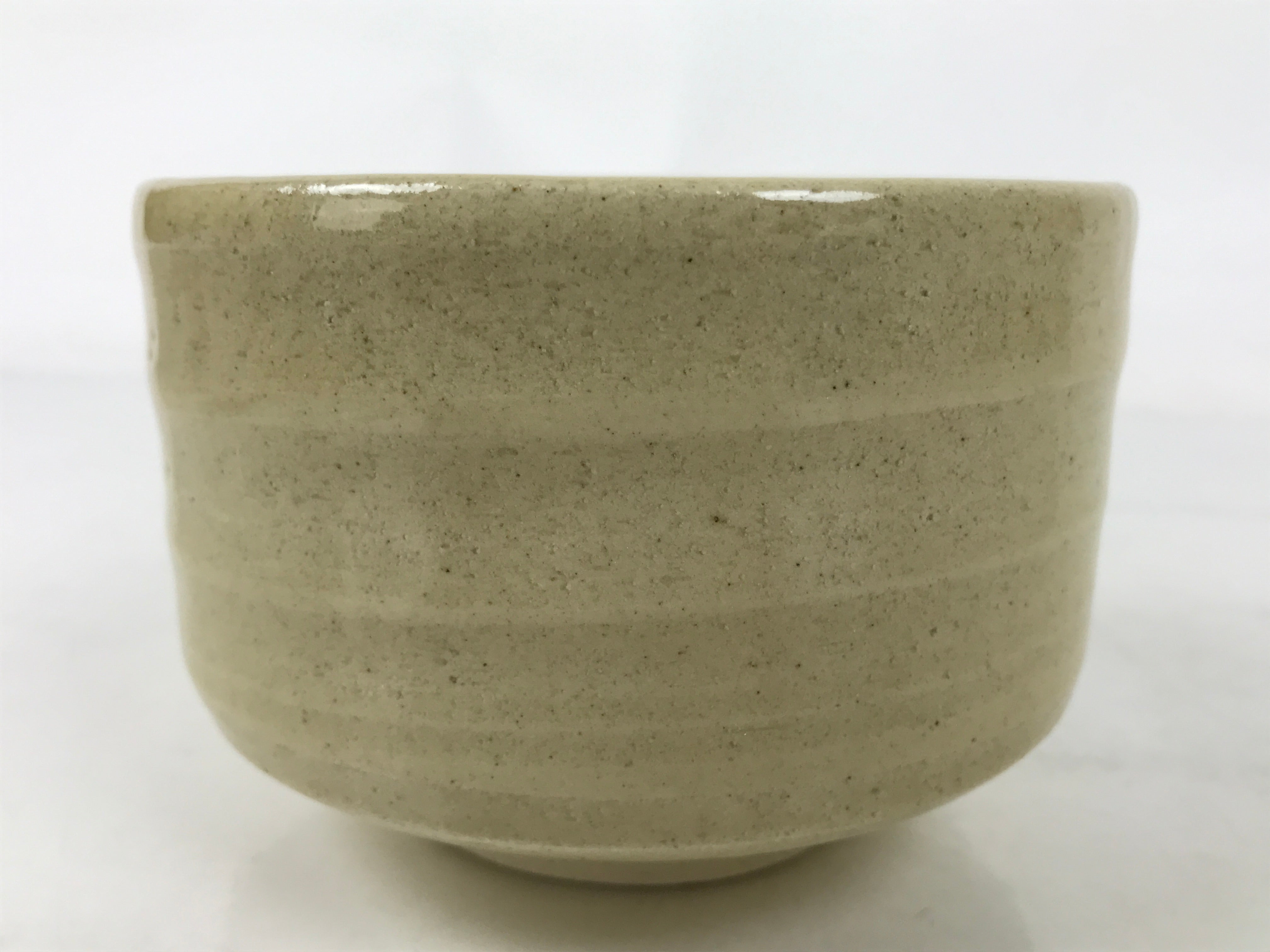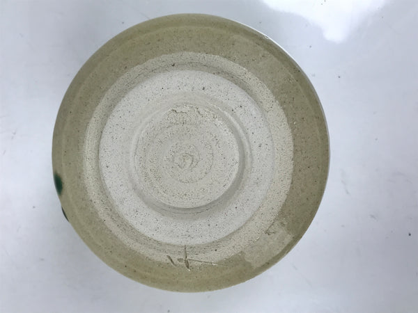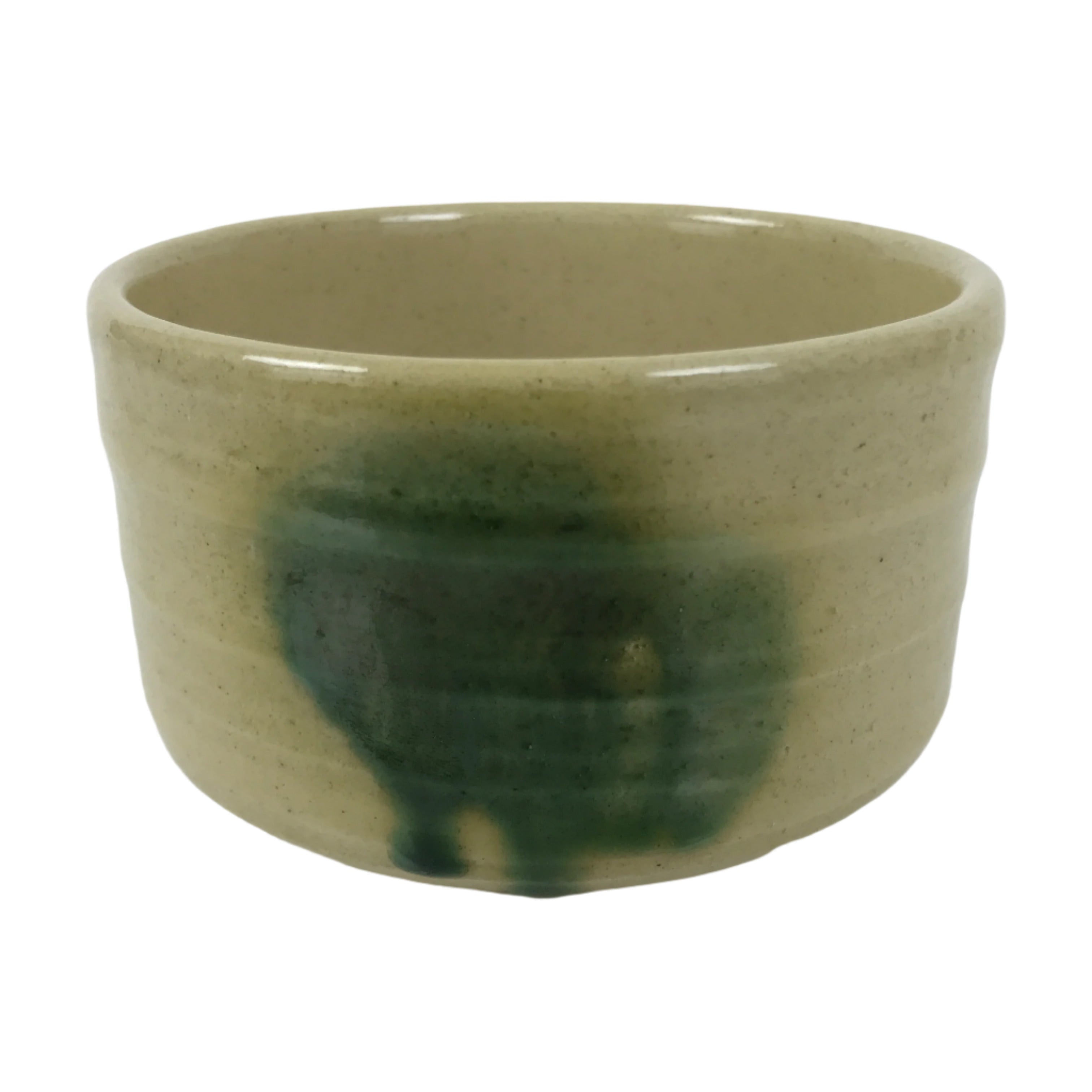 This is a vintage Japanese ceramic green tea bowl or matcha chawan. This bowl is beige with a touch of green glaze on the front. There is a sign near the foot.
