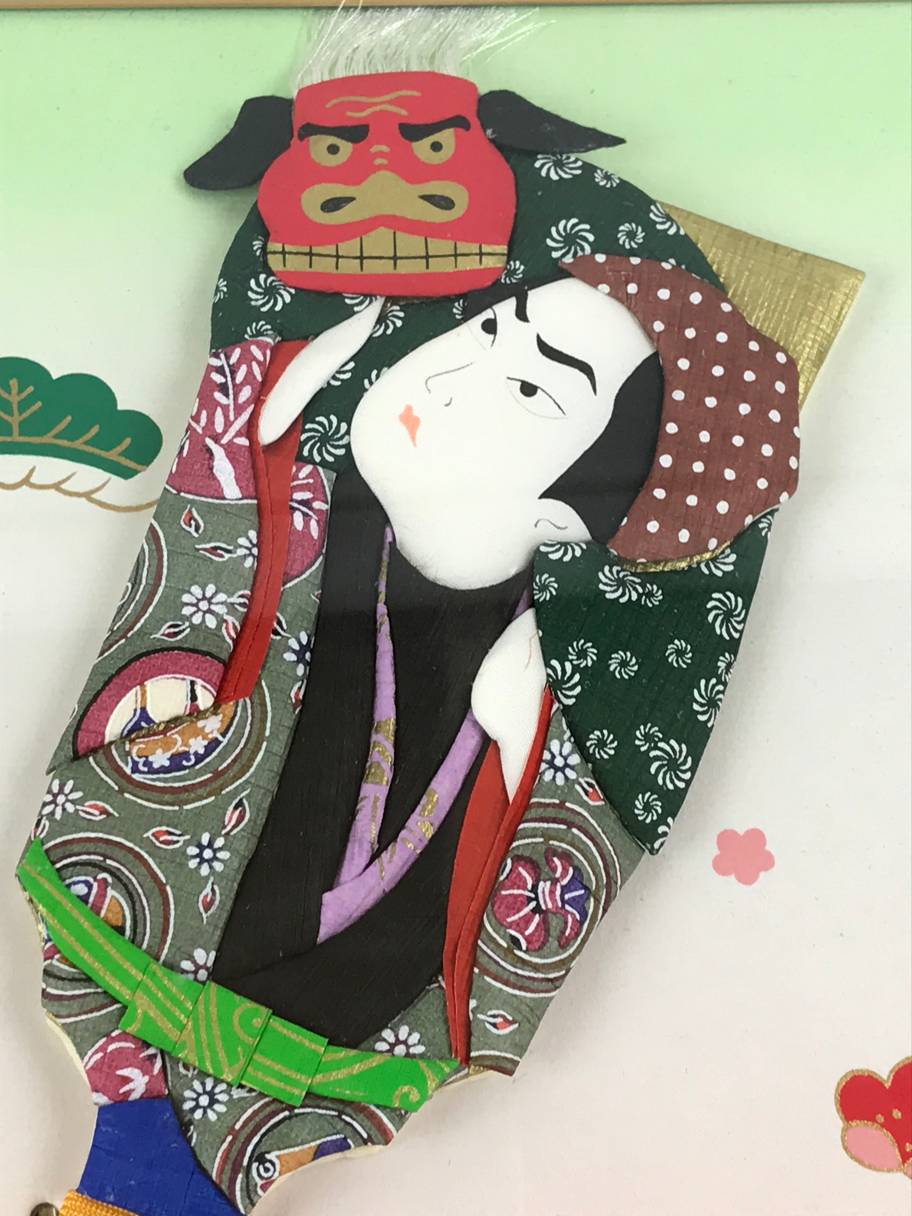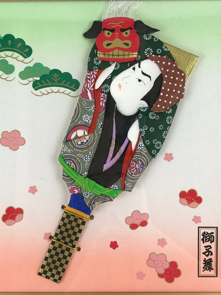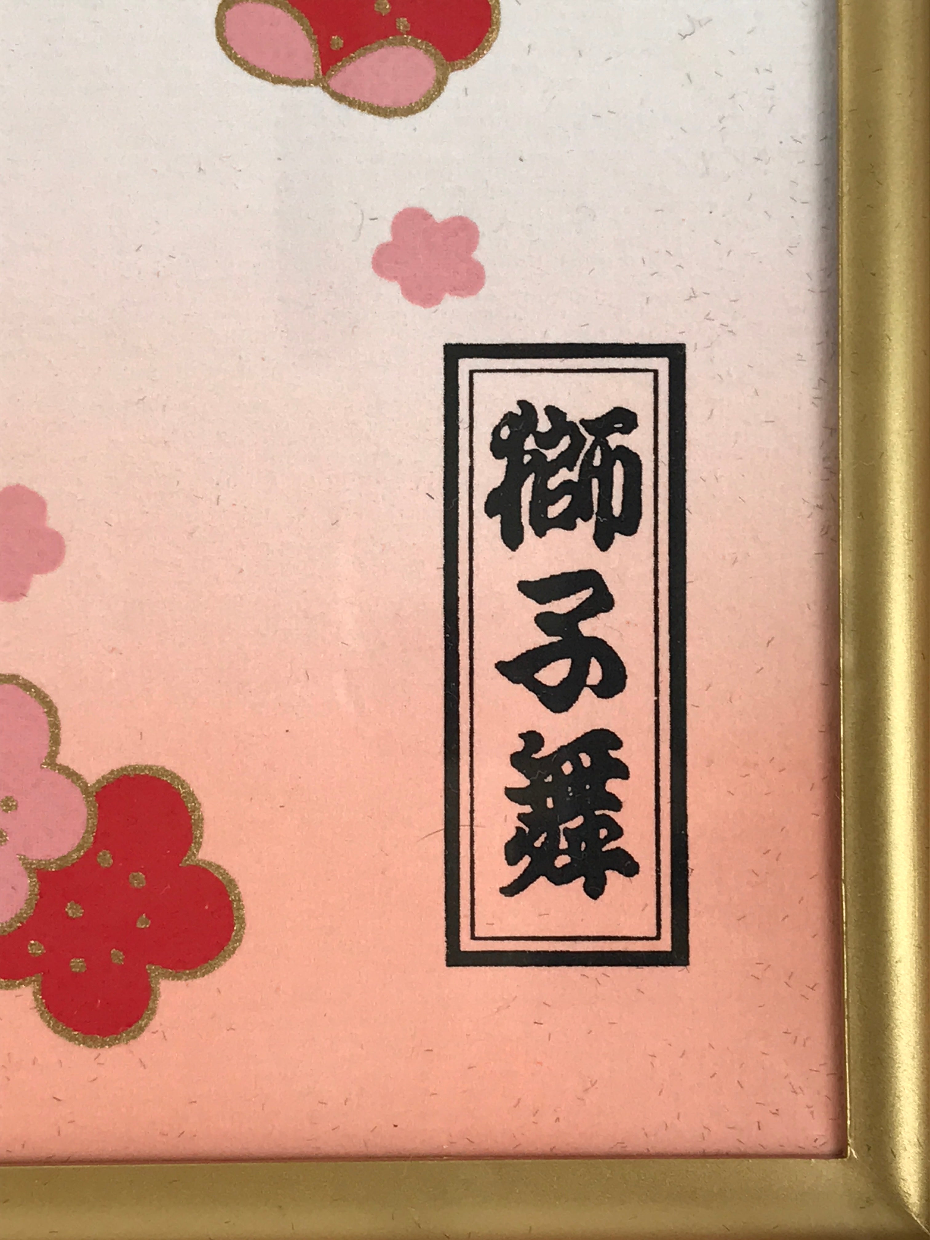 In a red lacquered wooden frame, this handcrafted hagoita (decorated wooden paddle usually used for games during New Year) depicts a dancer carrying a traditional shishi lion puppet. Initially, lion dances were performed at shrines and temples as a means to warn off evil spirits, but today, the reasons vary from region to region. The shikishi background also depicts plum blossoms and pine trees, a very common pairing that denotes hope and longevity respectively.