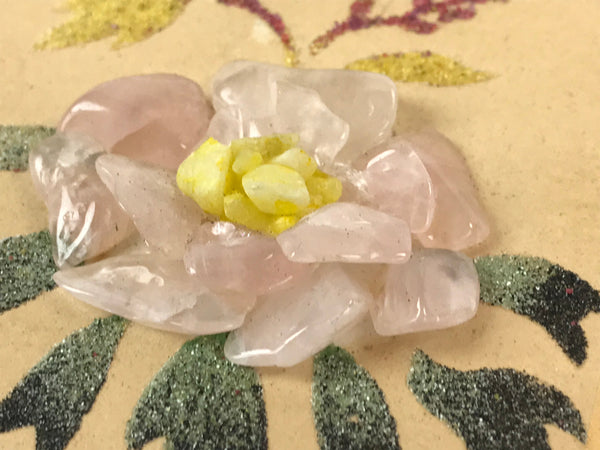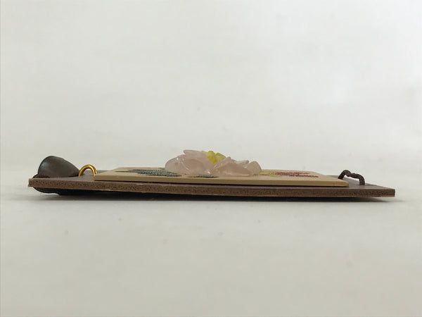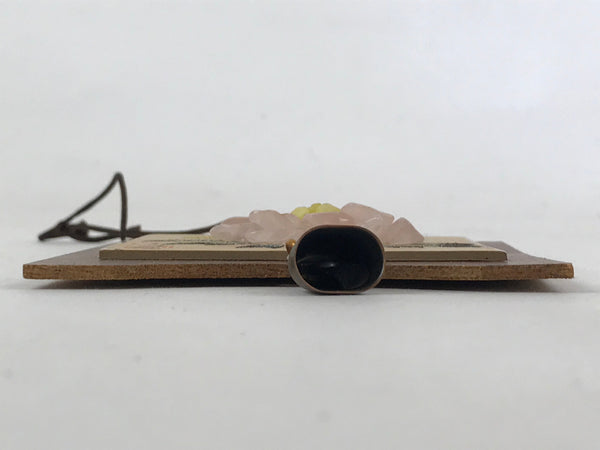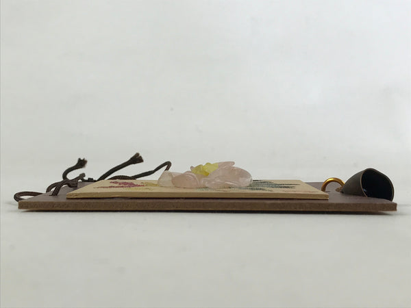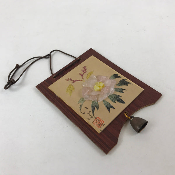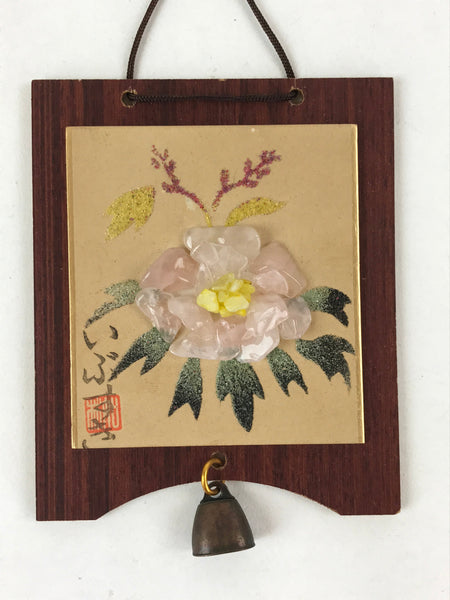 This is a Japanese vintage handmade hanging decoration. This hanging decoration is made of wood, paper and gemstones. The main design represents a flower with petals made from pink quartz. The center of the flower is made of other yellow gemstones. Other floral elements are painted. The artwork is signed with a seal and the following characters: いぶすき Ibusuki. The main design is attached to a piece of wood which can be hung thanks to an attached string. The bottom of the wooden piece is curved and decorated with a small metal bell.