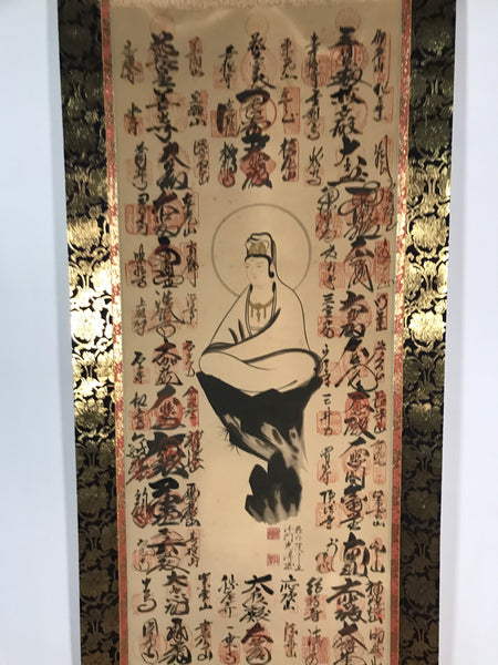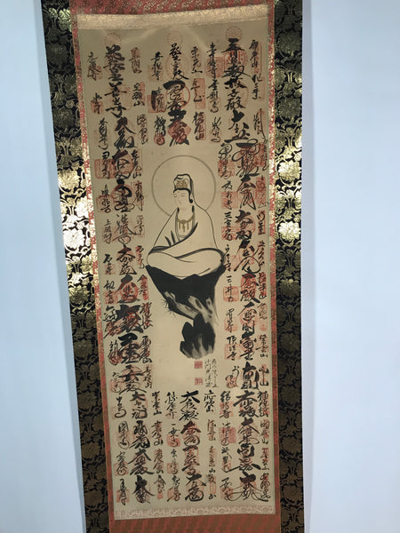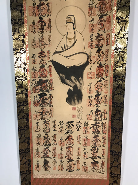 This vintage Japanese hanging scroll (kakejiku or makimono) features an image of the Buddhist deity Kannon. All around that central image, there are 33 names and goshuin red stamps of sacred places. This scroll has an inscription on the outside with the dates of beginning and end of completion (1984 and 1992) and a name.
