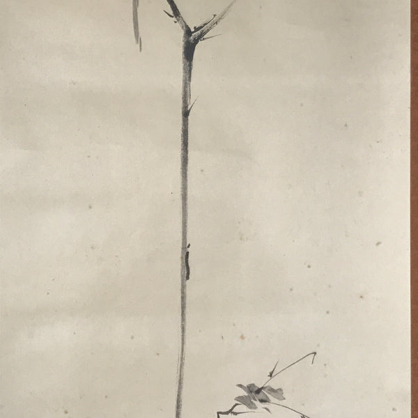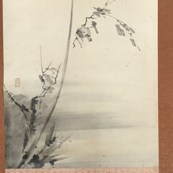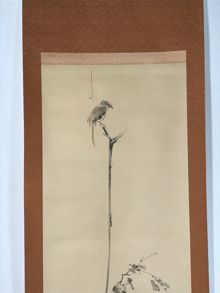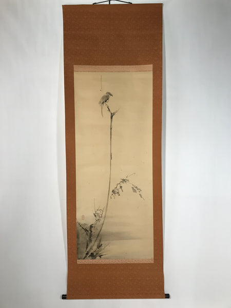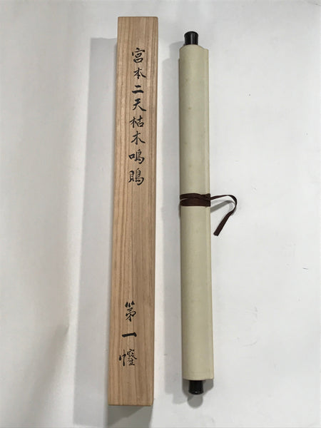 This vintage Japanese hanging scroll (kakejiku or makimono) features a reproduction of a picture by artist Miyamoto Musashi representing a bird standing at the top of a vertical branch of an old tree. The piece has a red seal. It is stored in a wooden box with the title and the artist's name on the lid, and a label on the inside.