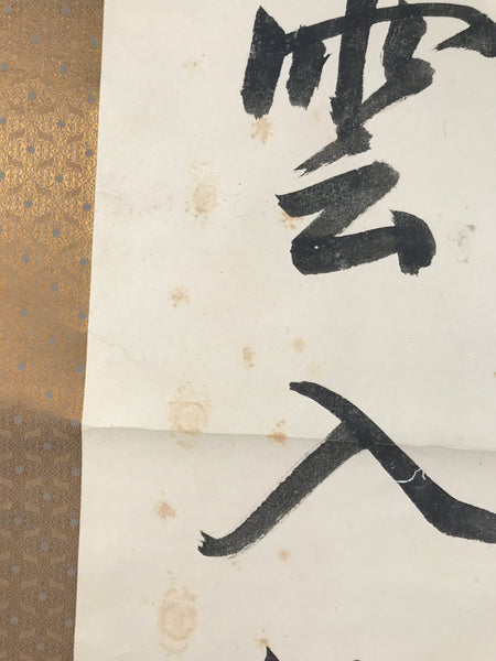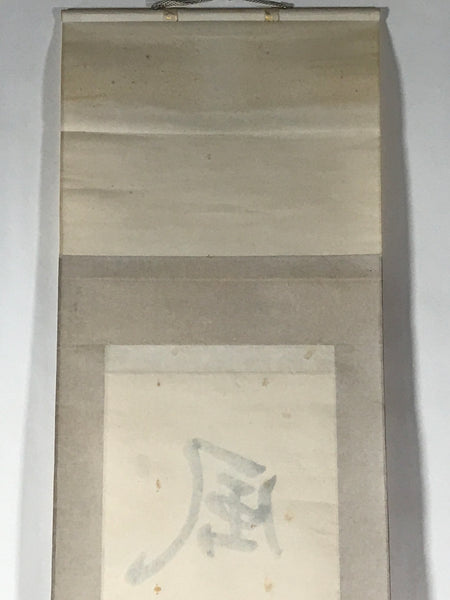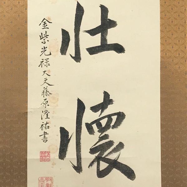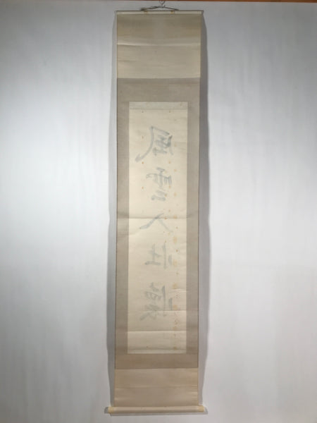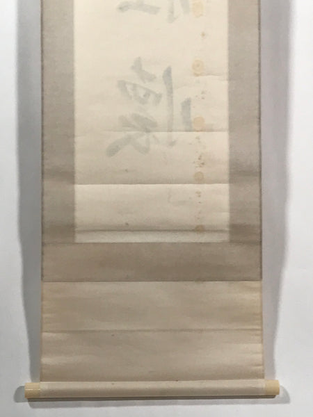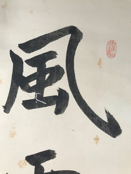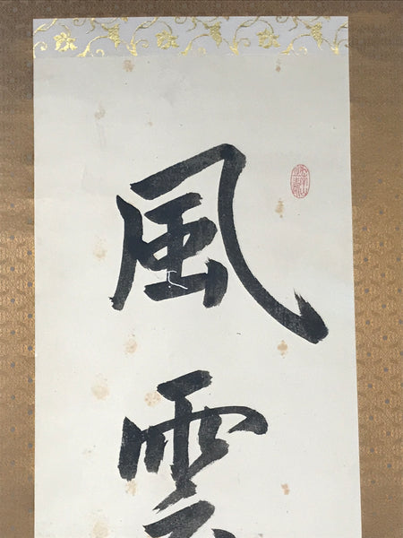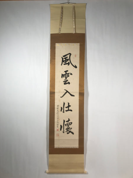 This vintage Japanese hanging scroll (kakejiku or makimono) features calligraphy of 5 kanji characters, likely a zen idiom/poem written in kanbun (literary Chinese). This piece is signed and has red seals.