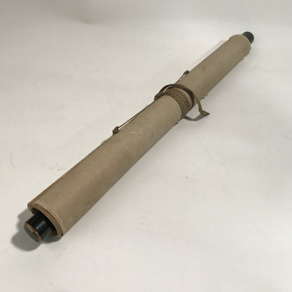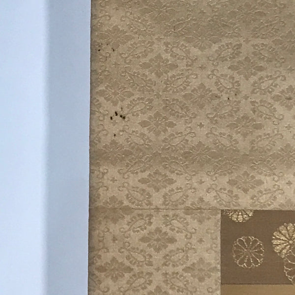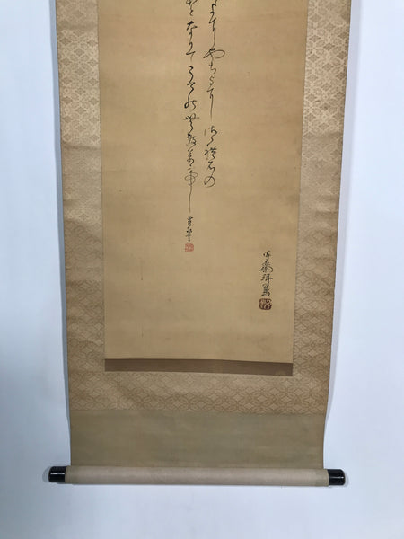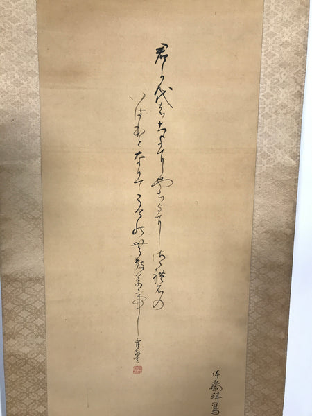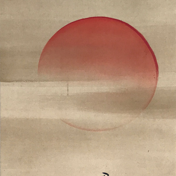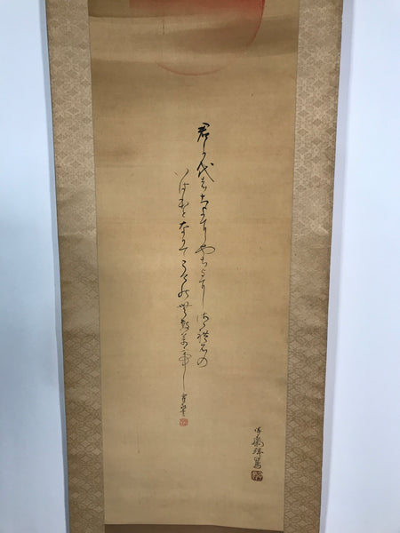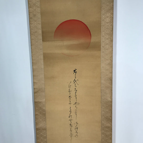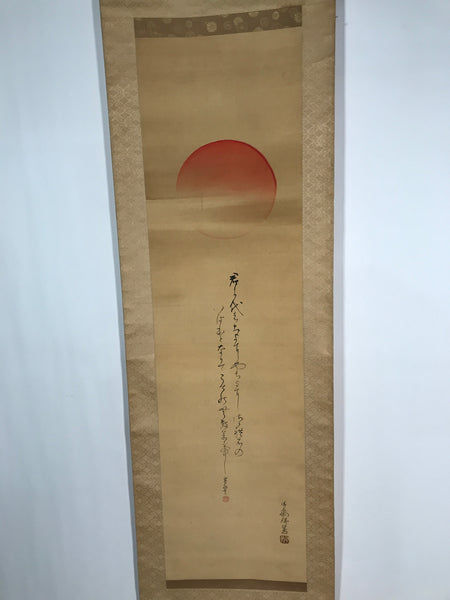 This vintage Japanese hanging scroll (kakejiku or makimono) features a red rising sun at the top and a calligraphy of a poem at the bottom. The scroll base is beige. This piece is signed and has red seals.