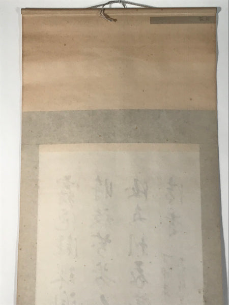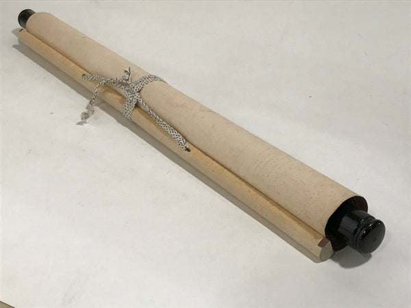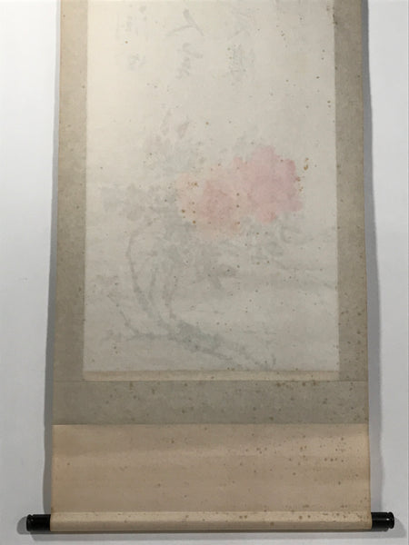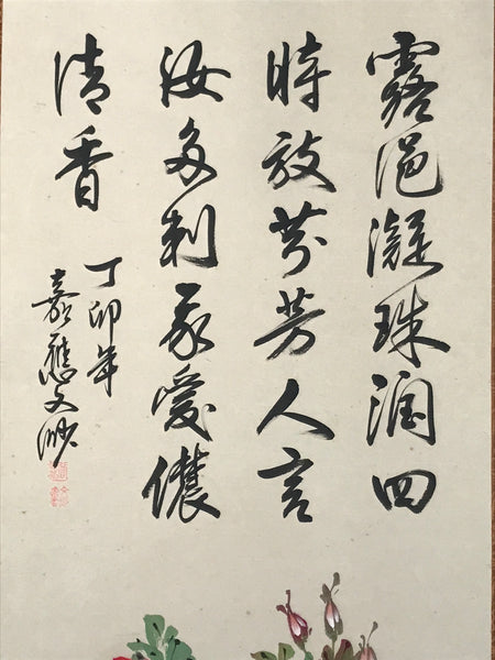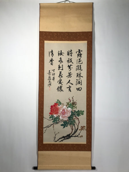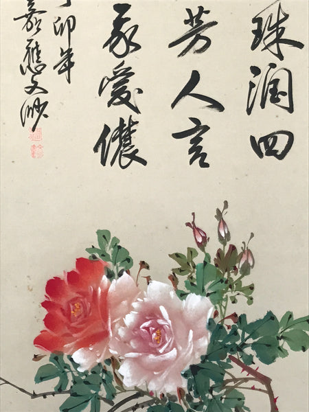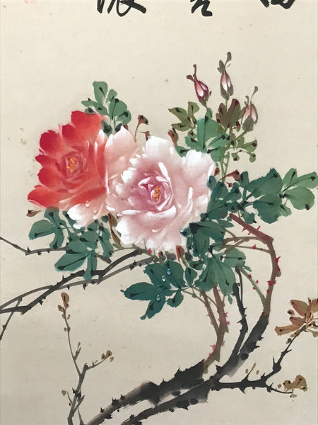 This vintage Japanese hanging scroll (kakejiku or makimono) features two beautiful Japanese wild roses (hamanasu or maikai) with a lot of petals. The flowers are pink and white, and red. The thorns of the shrub are very detailed. At the top, there is a poem with big black characters. This piece is dated and it is signed with a name and a red seal. There is an inscription on the outside.