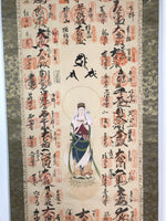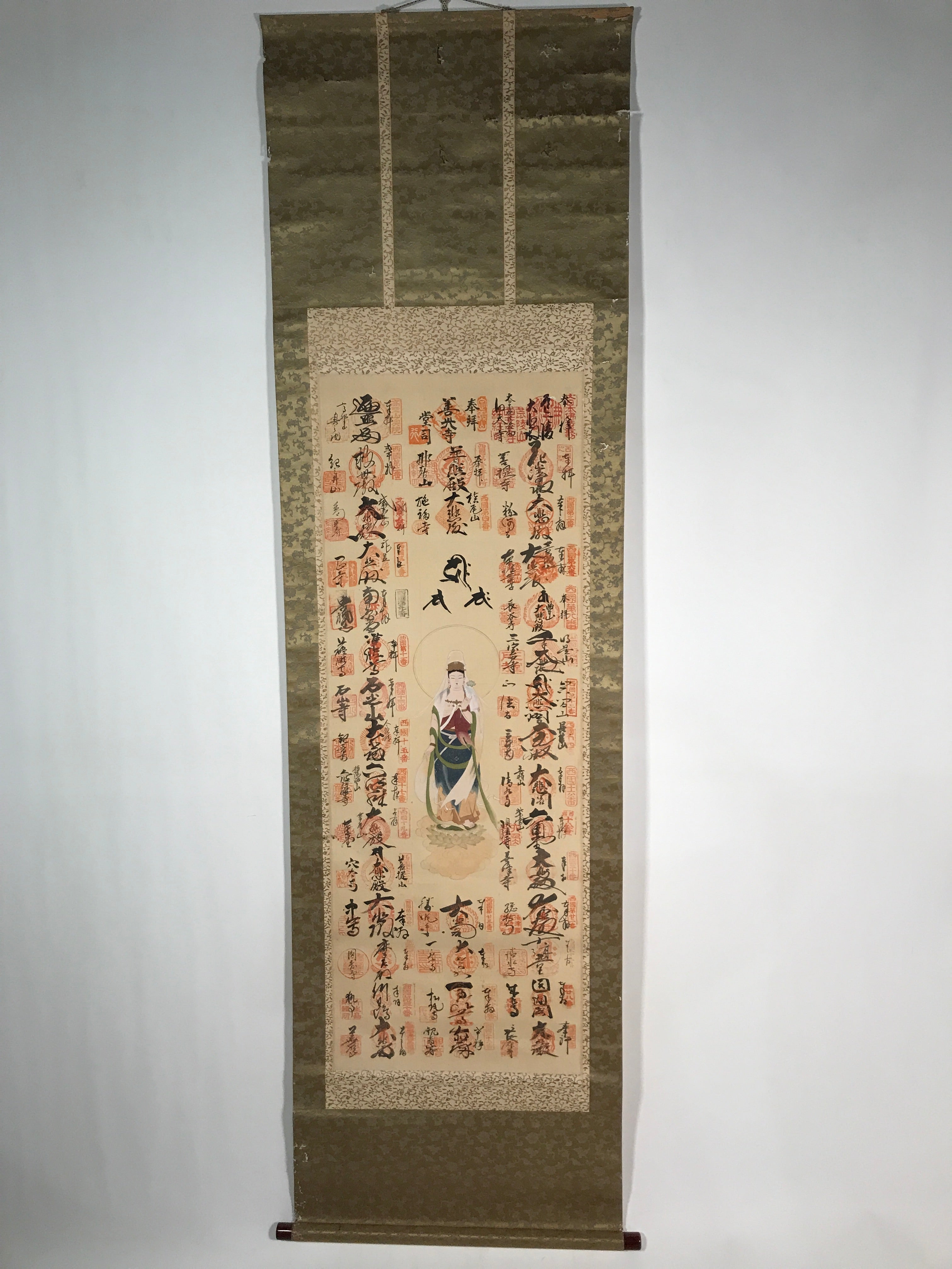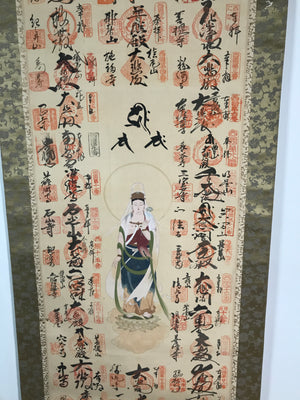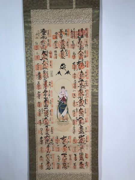This vintage Japanese hanging scroll (kakejiku or makimono) features an image of the Buddhist deity Kannon (Kannon Bosatsu). All around that central image, there are 33 names and goshuin stamps of sacred places such as temples part of the Saigoku Kannon Pilgrimage. This scroll has an inscription on the outside.