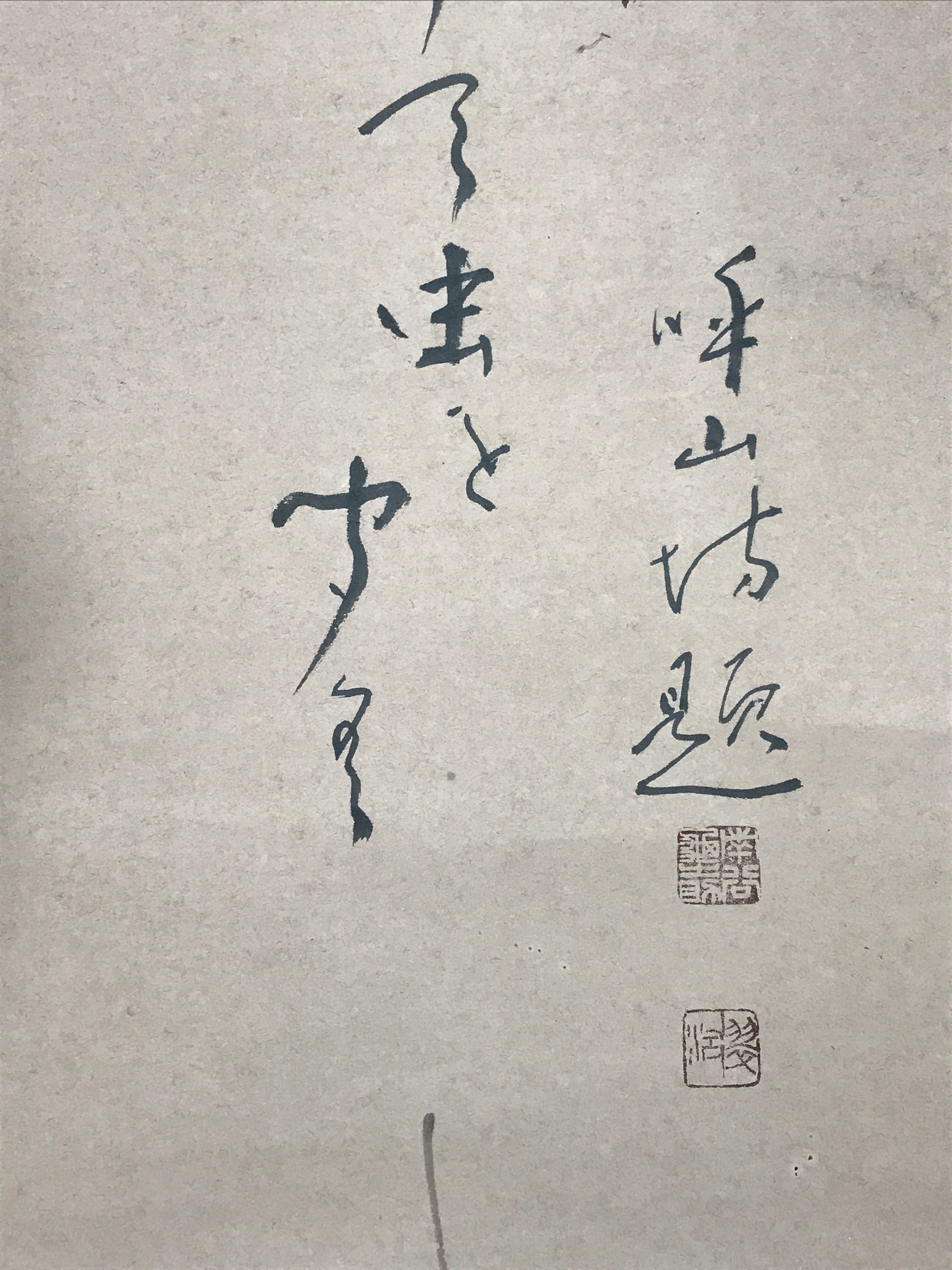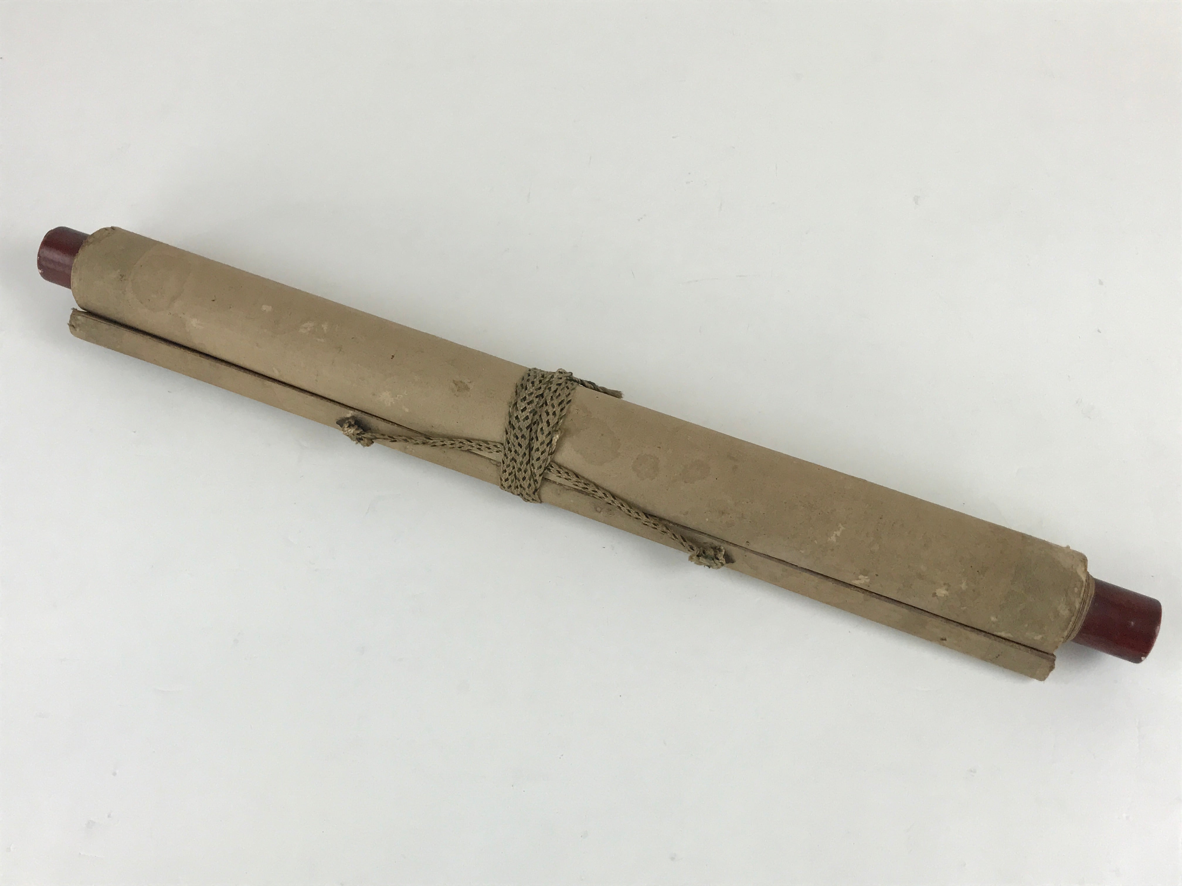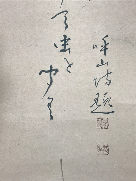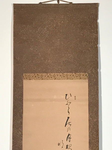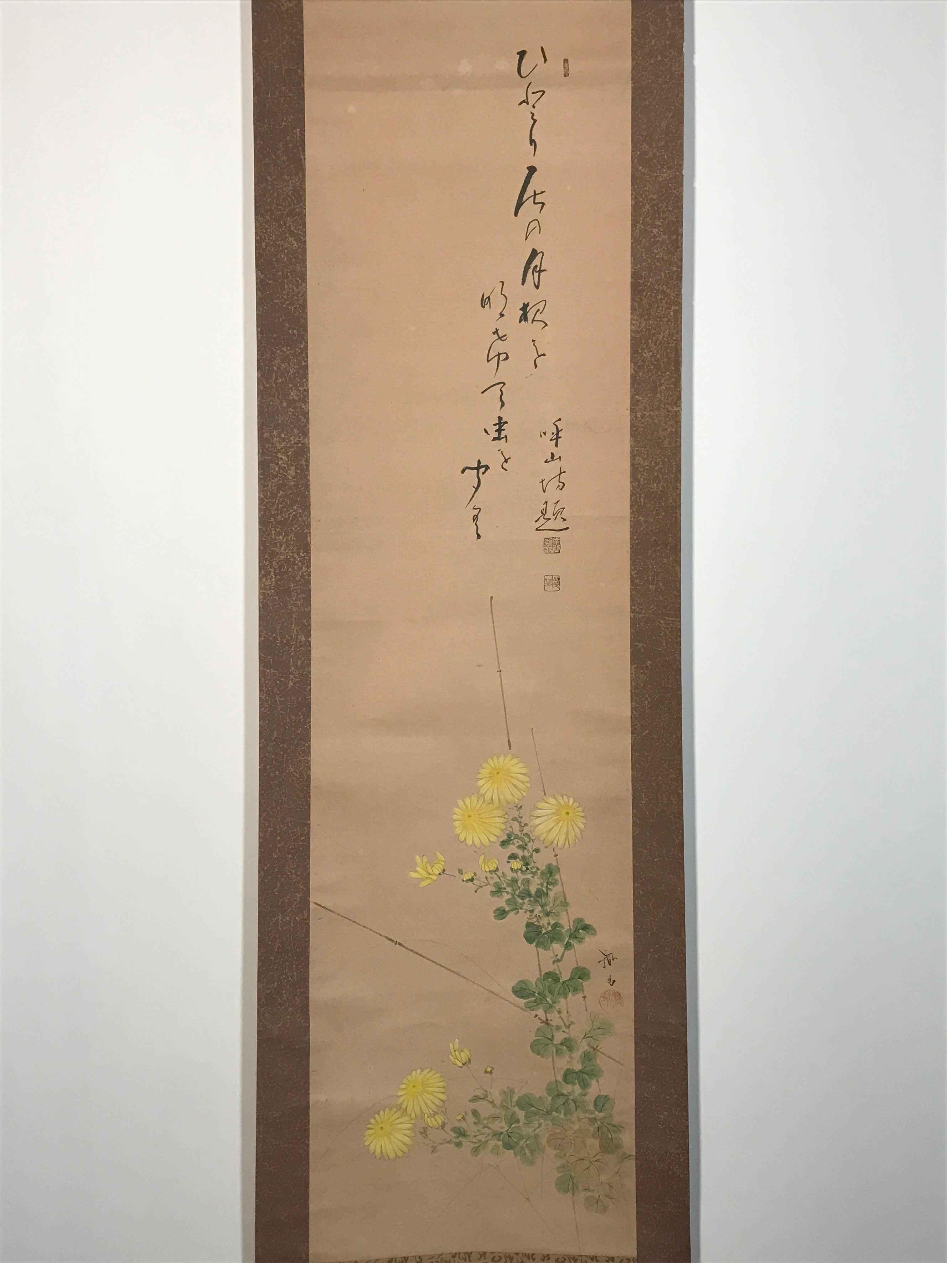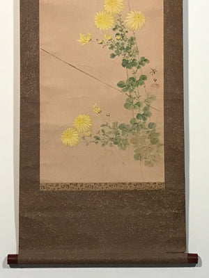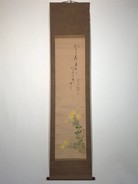 This is a vintage Japanese hang scroll Kakejiku. A yellow autumn chrysanthemum is drawn, and above it is a poem that expresses the scenery where insects sing. Kakejiku is a Japanese picture or calligraphy mounted on a piece of paper. Kakejiku was a tool to spread Buddhism in Japan. It has been integrated with Japanese culture as interior decoration. Tokokake is used at the Tokonoma in tatami room. Chakake has Zen words used in the tea ceremony room. Buddha-kake is used in the Buddhist altar.
