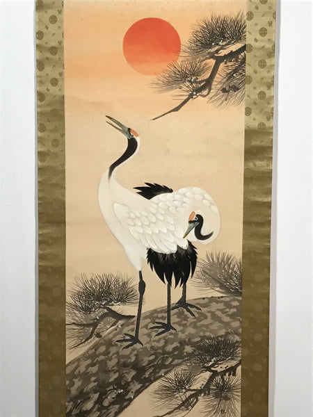This vintage Japanese hanging scroll (kakejiku or makimono) features two Japanese cranes standing on a pine tree. This piece is signed with a name and a red seal. It is stored in a paper box.