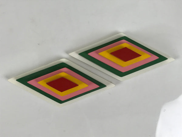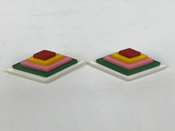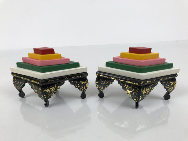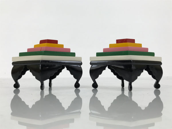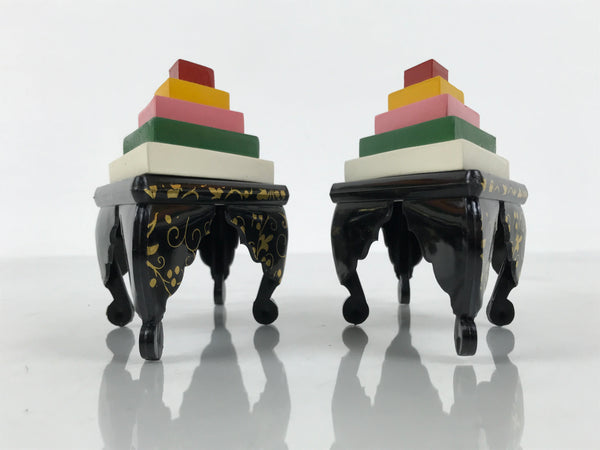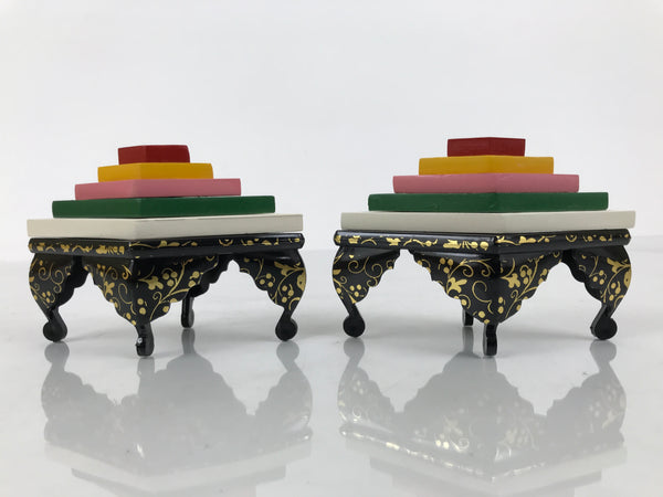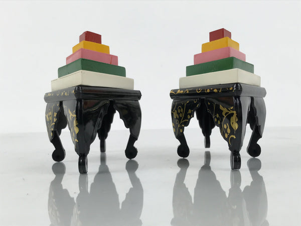 This Japanese vintage ohinasama doll accessory set of two diamond-shaped offering tables for hishi mochi (layer mochi) is the perfect addition to any existing hina set or adds gorgeous Eastern flair to any home decor. This accessory set is typically placed on the hinadan, the doll shelf, as decoration. The two resin tables are black with gold embellishments. The rice cake (mochi) parts are made of wood and feature 5 layers.