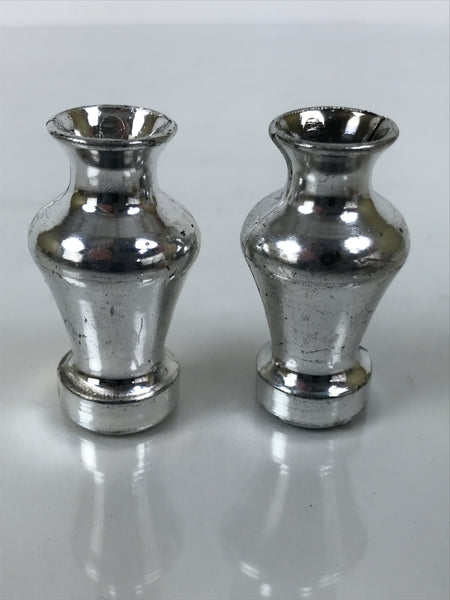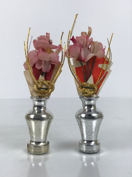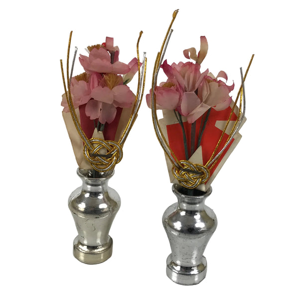 This Japanese vintage ohinasama doll accessory set of two vases with flowers is the perfect addition to any existing hina set or adds gorgeous Eastern flair to any home decor. These vases are typically placed on the hinadan, the doll shelf, as decoration. Both silver vases are resin, and the pink sakura flowers are paper. Please note: the papers behind the flowers have slightly different colors.
