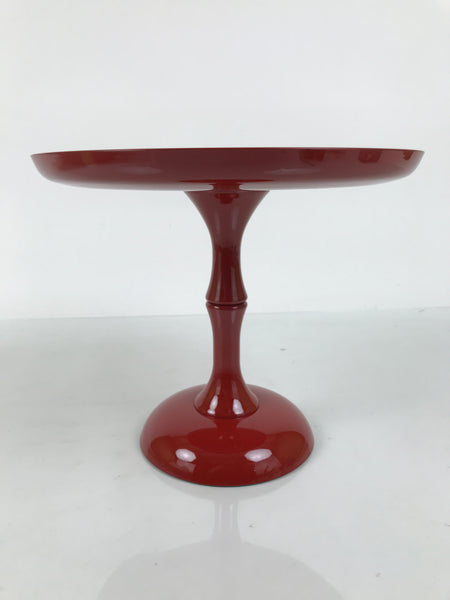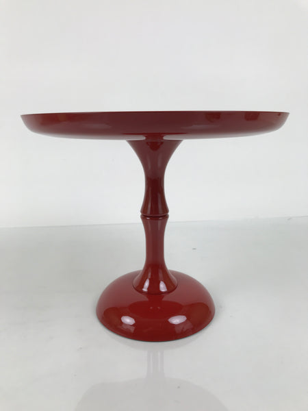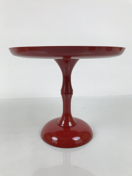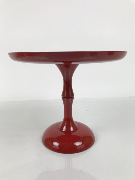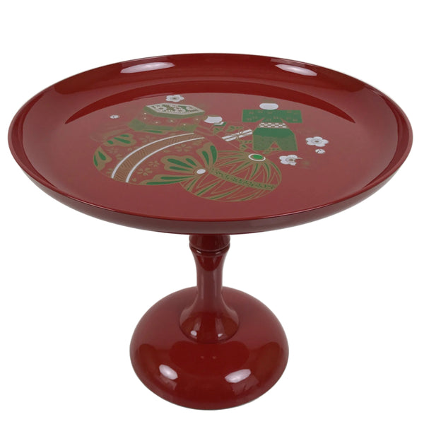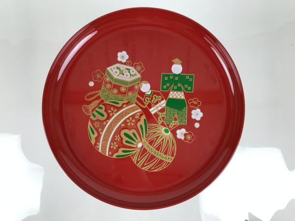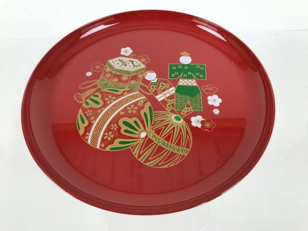 This is a vintage Japanese resin lacquer replica takatsuki offering table. It is made of resin plastic to mimic the look of red lacquered wood. It is used during Hina Matsuri (Girl's Day) in the gorgeous displays of dolls. It is a glossy red with a printed design on the top surface that features plum blossoms, temari balls, and tachibina (prince and princess pair). It disassembles in two places and comes with the original box.