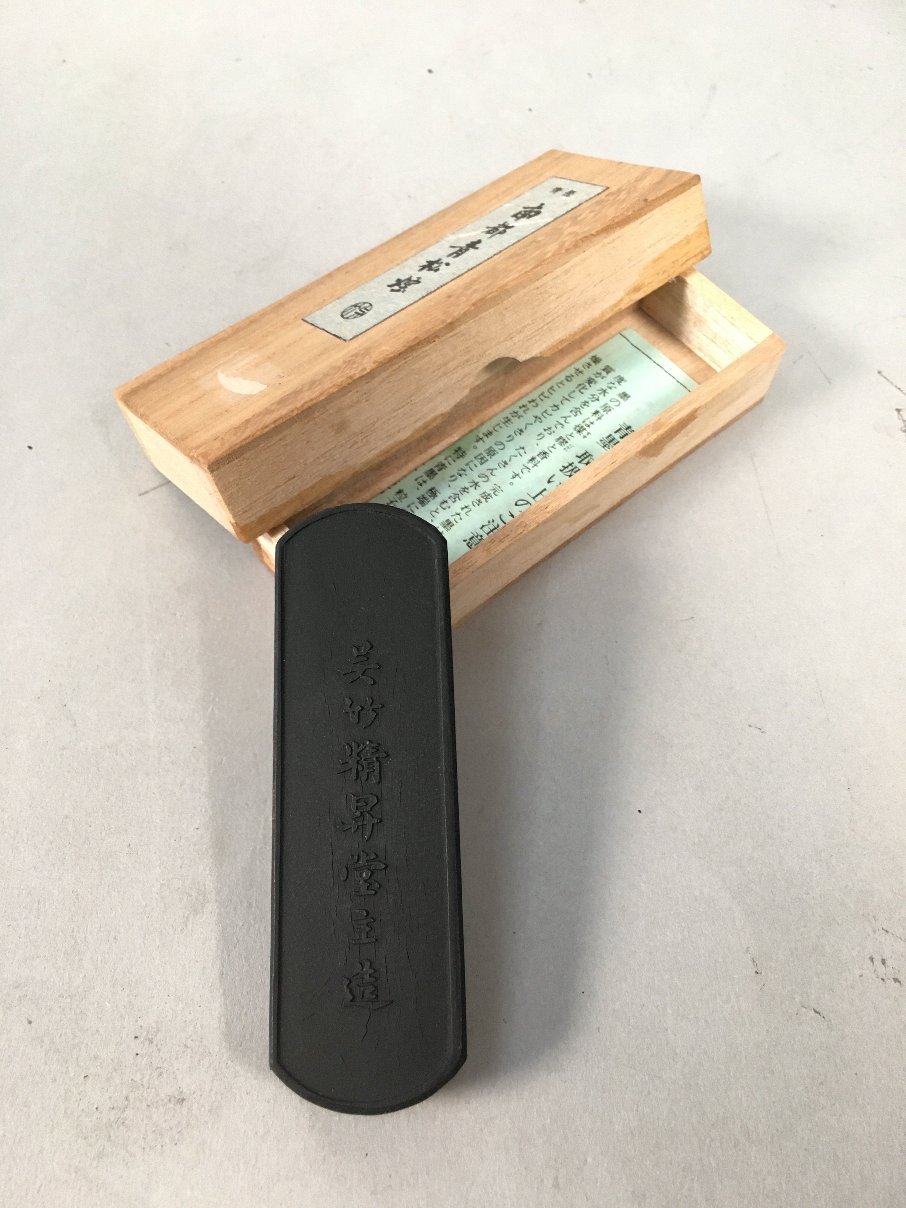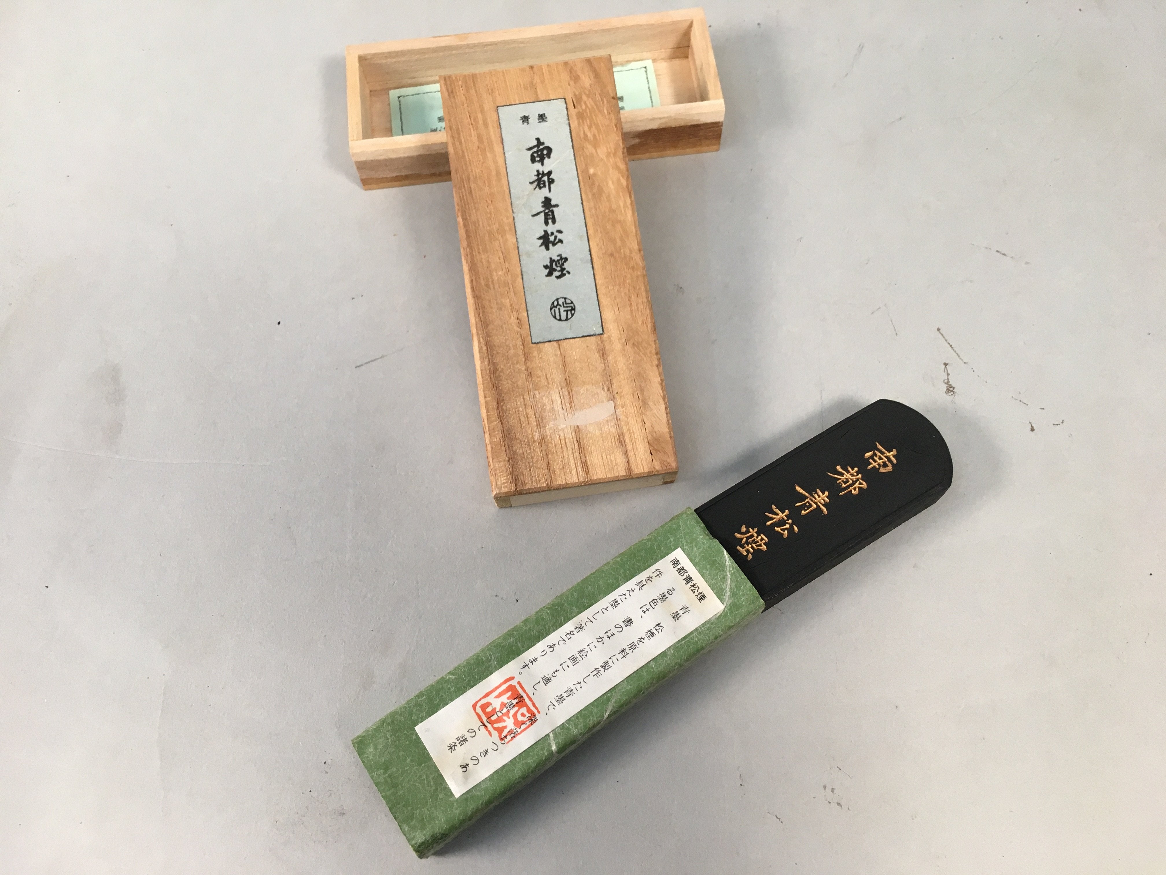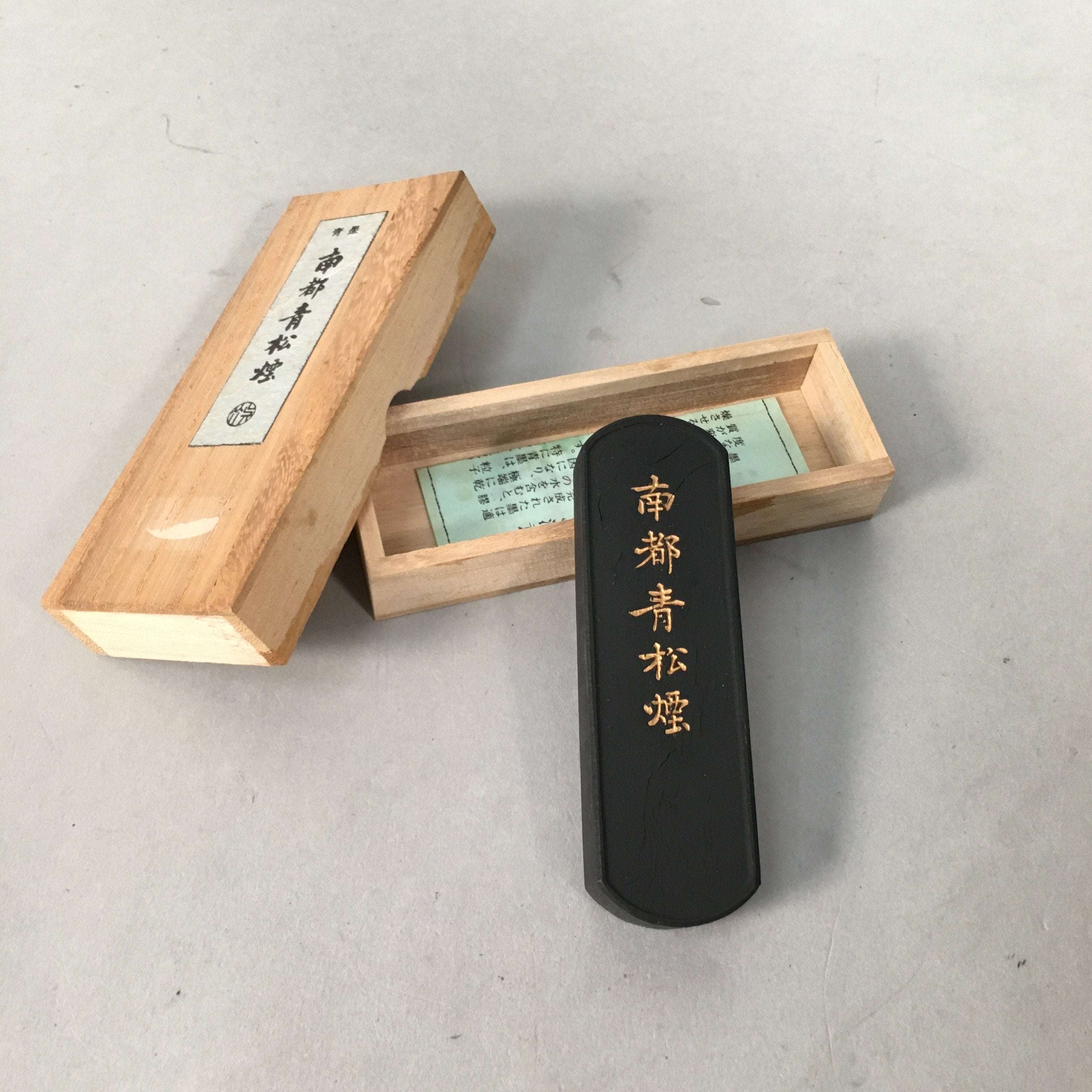 - Kanji on the wooden box and ink stick reads Aozumi Nanto Seishoen, which is the product name of this ink stick