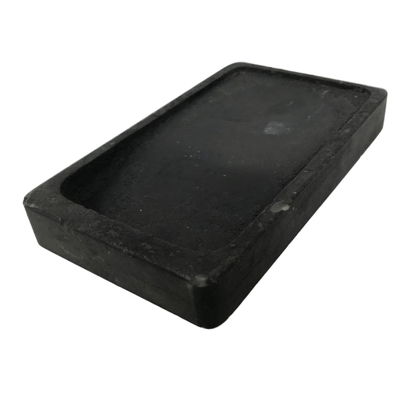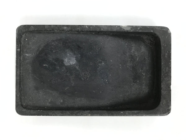 This is a vintage Japanese inkstone, suzuri, used for grinding sumi and holding ink. It is a necessary tool in calligraphy (shodo) and traditional penmanship (shuji). It is made of a black stone. The surfaces are smooth.