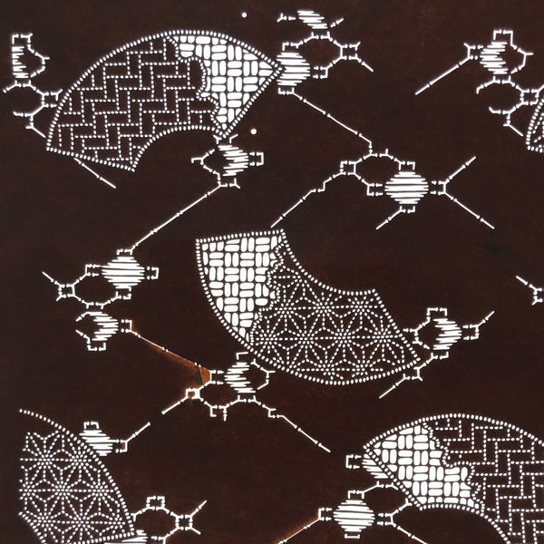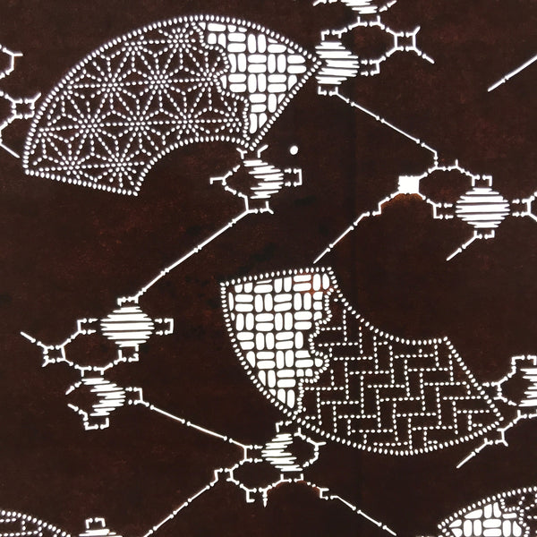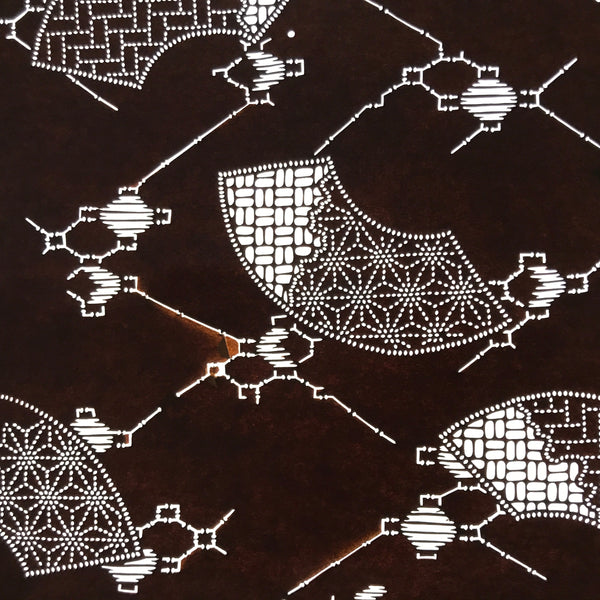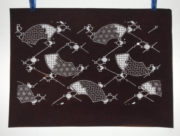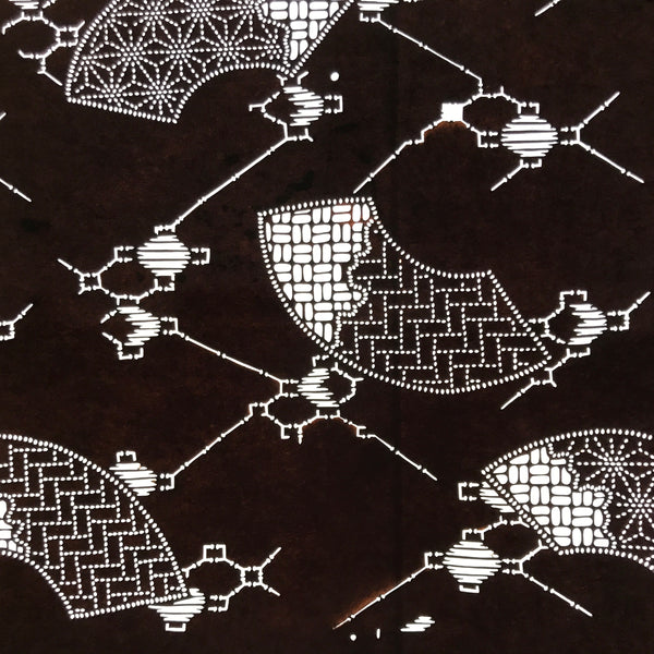 Using traditional mulberry washi paper, this Ise katagami stencil has a prominent folding fan design that features traditional Japanese patterns (asanoha, higaki, and sangokuzushi). Between each fan are fine lines that connect at what looks like paper lanterns.