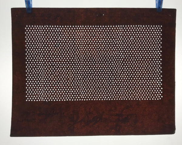 This antique Katagami was designed during the mid or late Edo period (1860) to early Meiji (1900) in Central Japan. It is made of two or more layers of handmade mulberry washi paper laminated together and waterproofed with persimmon tannin. Katagami printing uses a technique called resist dye where a paste is applied to the fabric with the katagami before dipping in ink. The open space on the katagami will be a negative space in the printed design.