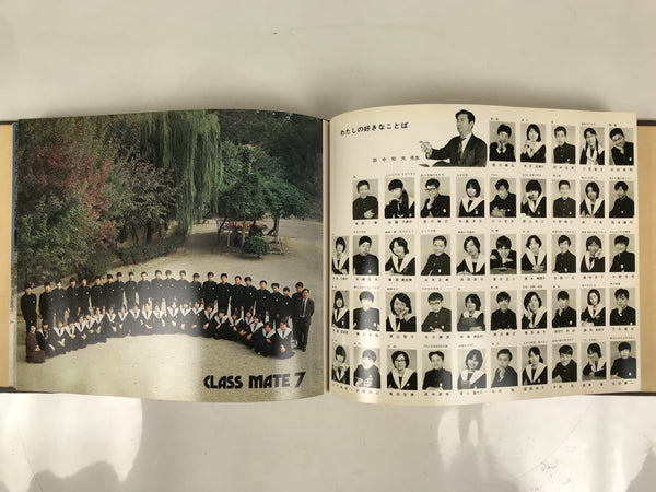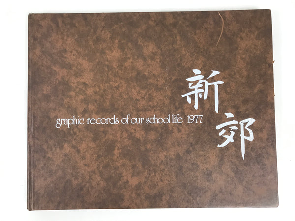 This vintage graduation year book from 1977 features group pictures in color of 7 classes of junior high school students (Nagoya City Shinko Public Junior High School), school club members, and school field trips. The pictures have a legend and there are pages with the name of the students and teachers. The cover is brown with a white title.