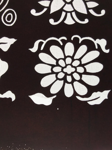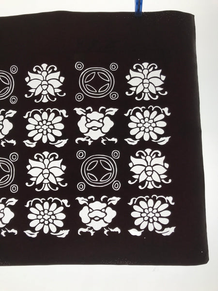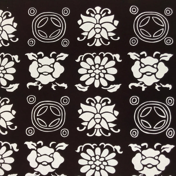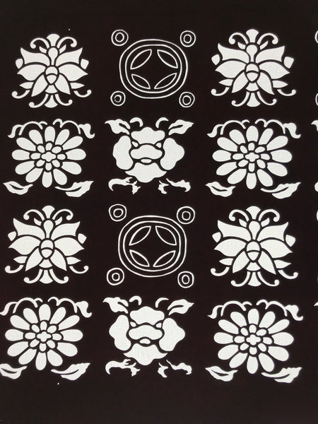 Using traditional mulberry paper, this katagami stencil with silk mesh backing features a traditional shippo pattern which stands for "7 treasures". It also showcases a chrysanthemum, peony, and maybe lotus design.