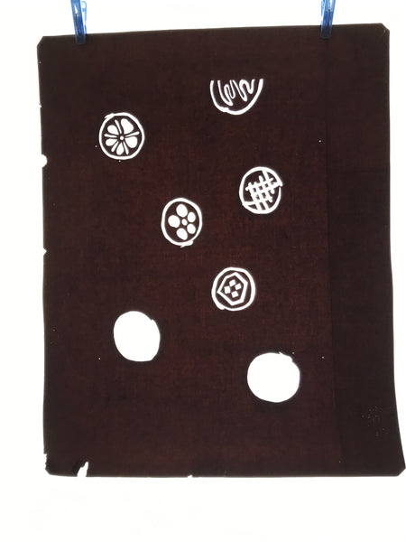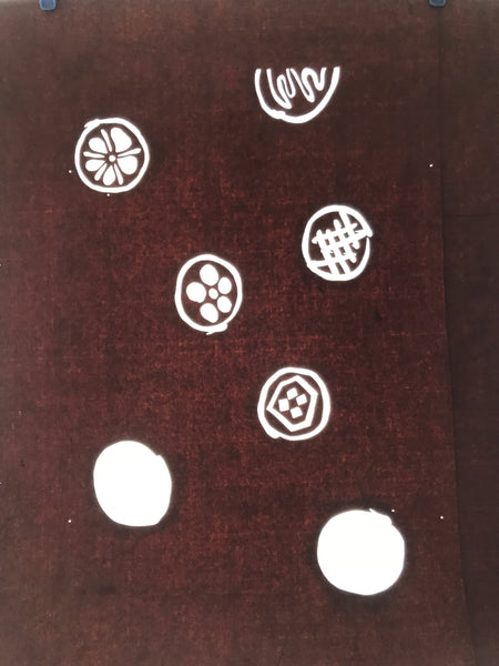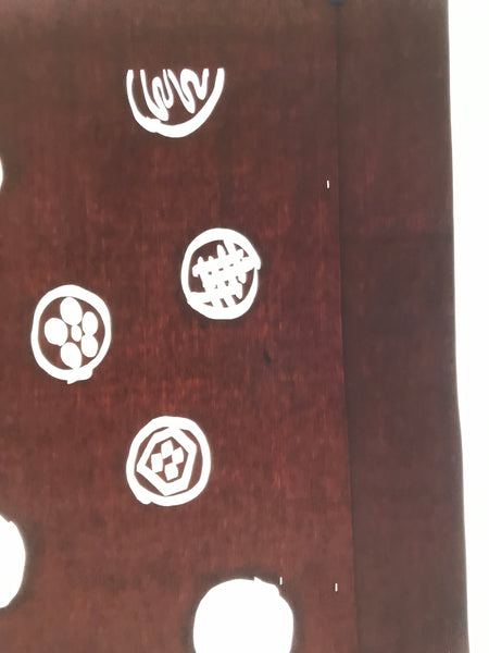 This antique Katagami was designed during the mid or late Edo period (1860) to early Meiji (1900) in Central Japan. It is made of two or more layers of handmade mulberry paper laminated together and waterproofed with persimmon tannin. Katagami printing uses a technique called resist dye where a paste is applied to the fabric with the katagami before dipping in ink. The open space on the katagami will be a negative space in the printed design.
