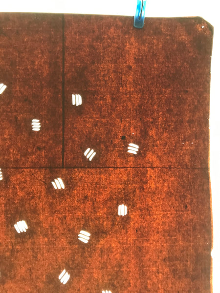 This antique Katagami was designed during the mid or late Edo period (1860) to early Meiji (1900) in Central Japan. It is made of two or more layers of handmade mulberry paper laminated together and waterproofed with persimmon tannin. Katagami printing uses a technique called resist dye where a paste is applied to the fabric with the katagami before dipping in ink. The open space on the katagami will be a negative space in the printed design.