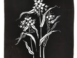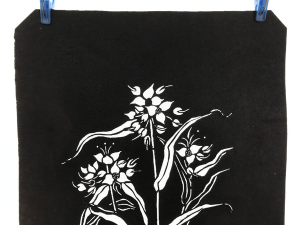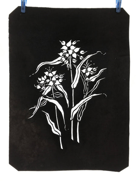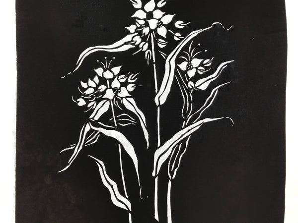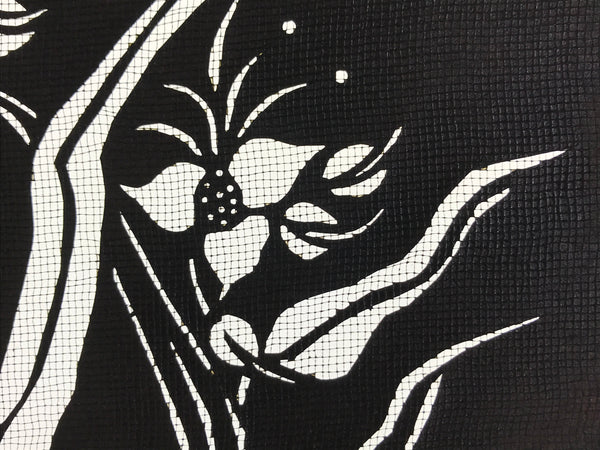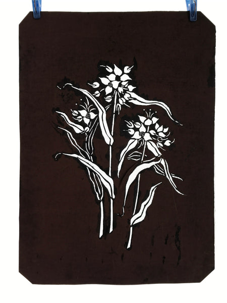 Using traditional mulberry paper, this katagami stencil with a silk backing is decorated with a natural flower design with long wispy leaves.