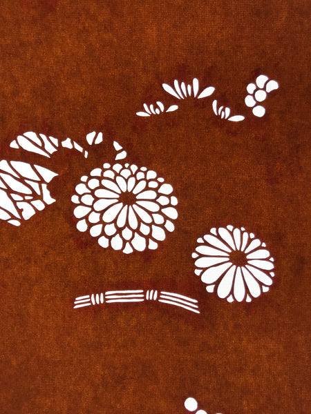 Using traditional mulberry paper, this katagami stencil with silk mesh backing features a simple, scattered design of plants (mostly leaves) and large chrysanthemum flowers.