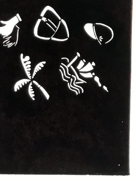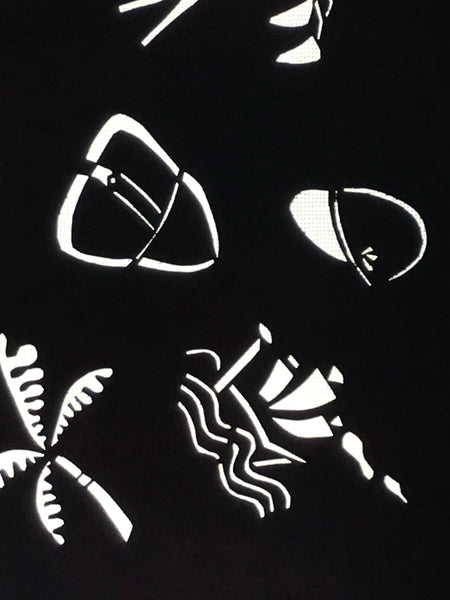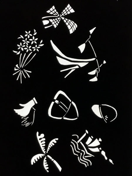 Using traditional mulberry washi paper, this katagami stencil with silk backing features a random selection of travel-themed image such as a palm tree, windmill, boat, and a pair of gloves.