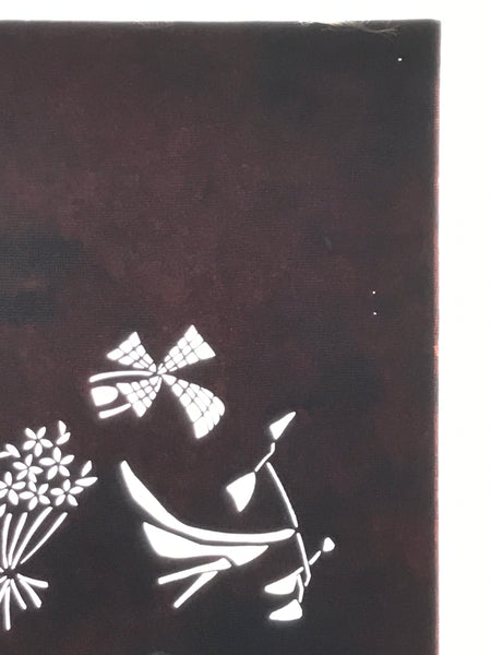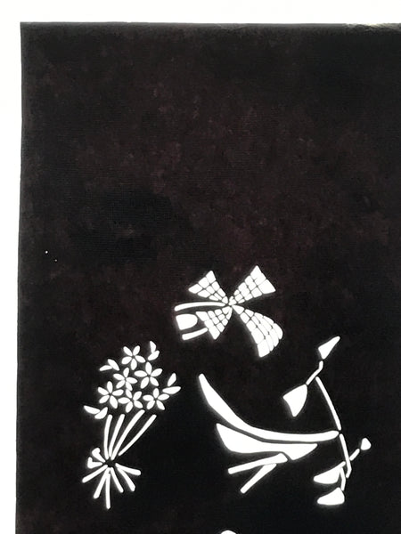 This antique Katagami was designed during the mid or late Edo period (1860) to early Meiji (1900) in Central Japan. It is made of two or more layers of handmade mulberry washi paper laminated together and waterproofed with persimmon tannin. Katagami printing uses a technique called resist dye where a paste is applied to the fabric with the katagami before dipping in ink. The open space on the katagami will be a negative space in the printed design.