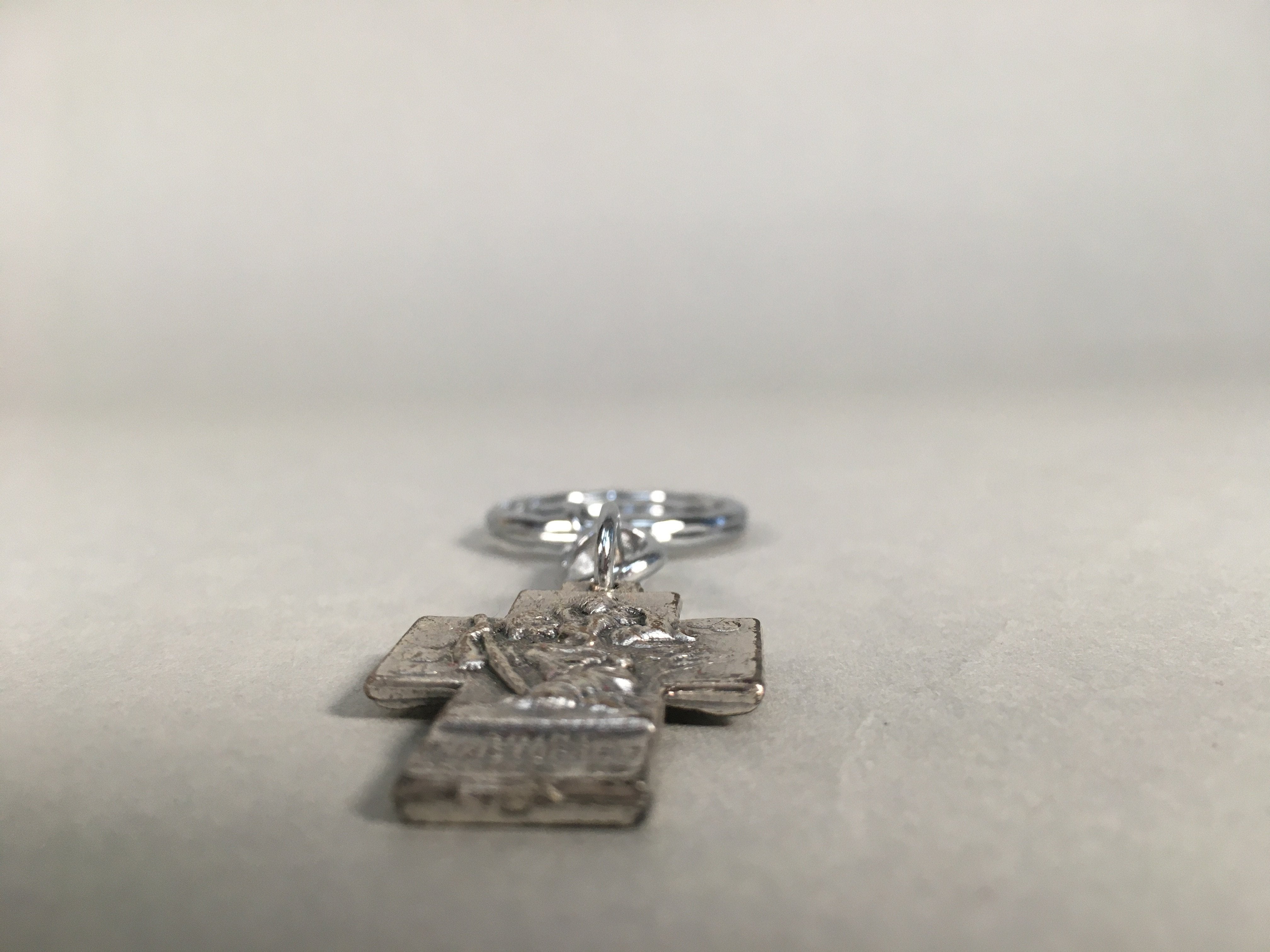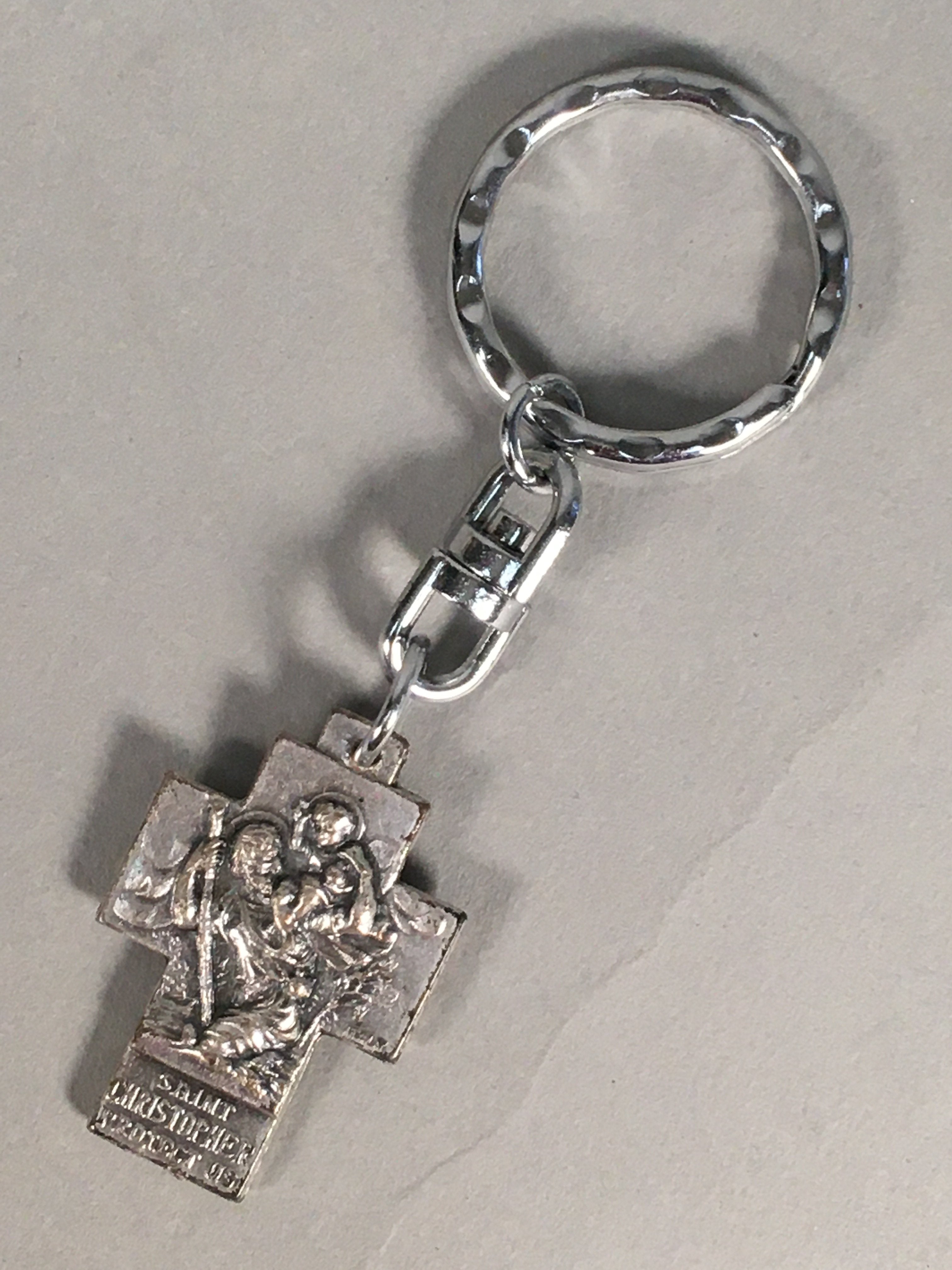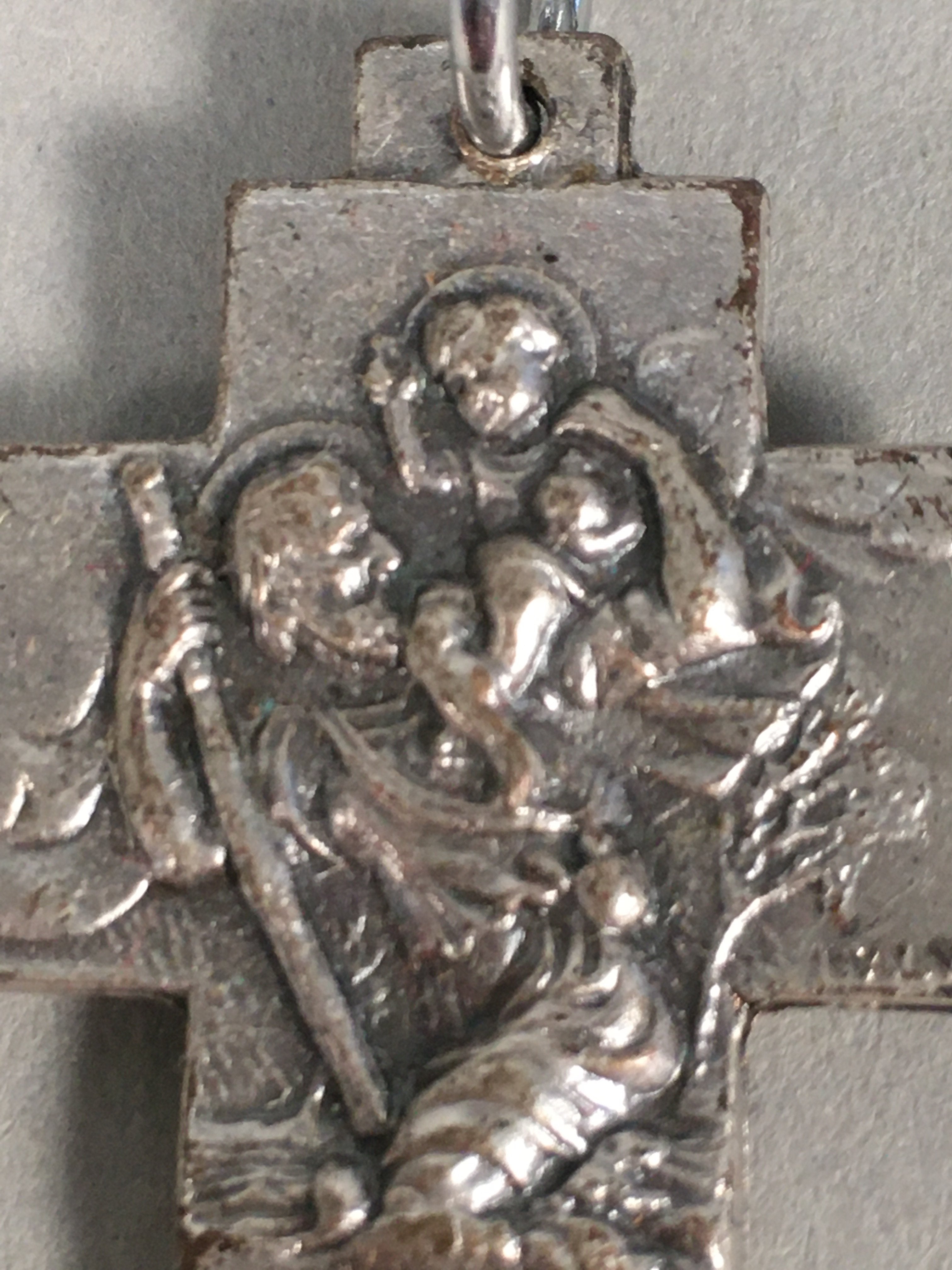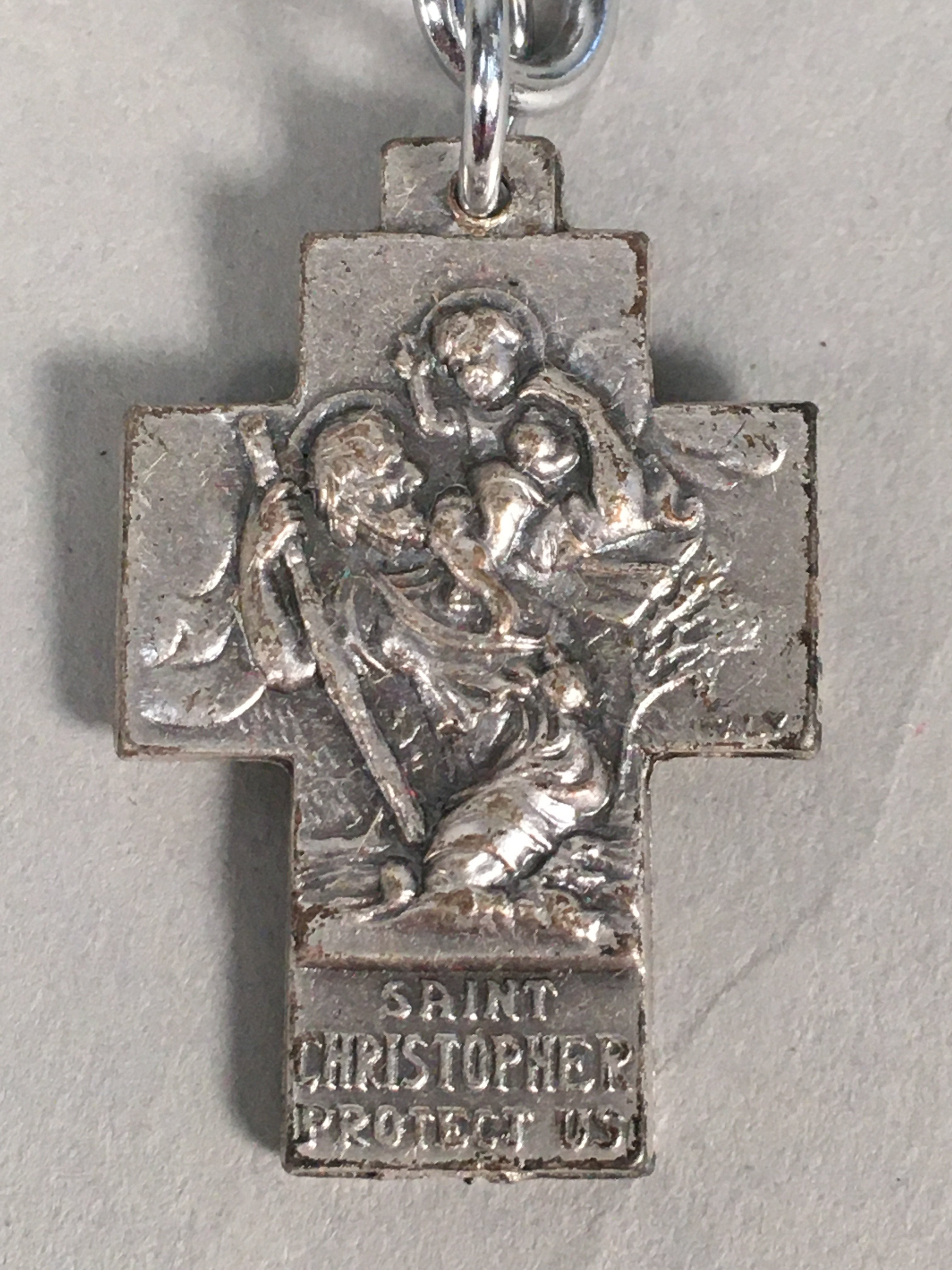 • one side: Saint Christopher holding Jesus on his shoulder, Saint Christopher protect us