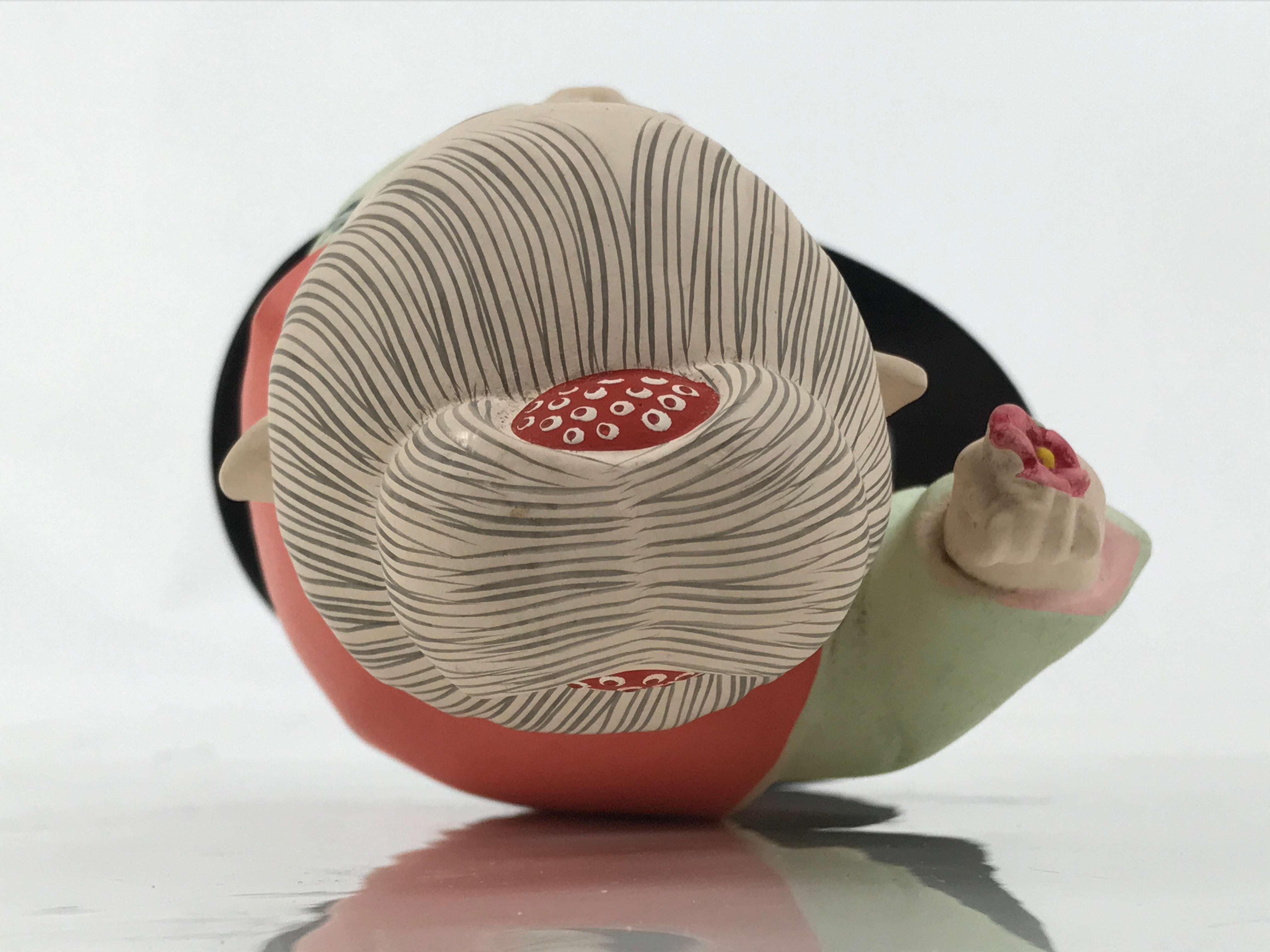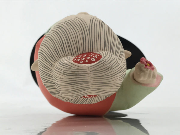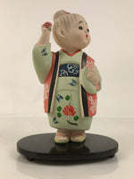 This vintage Japanese decorative figurine represents a girl wearing a light green floral kimono with a blue and white obi belt. This doll has a chubby figure and has her hair gathered in a bun. She holds a camellia flower in one of her hands. The figurine is attached to a black wooden stand.