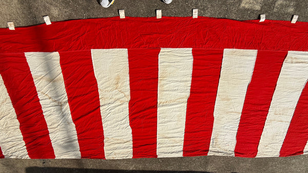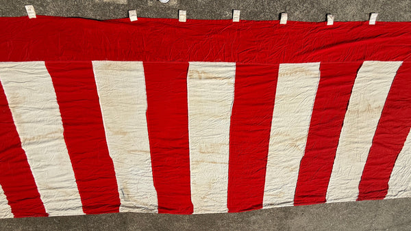 This is a vintage Japanese kohakumaku fabric divider. It features large red-and-white vertical stripes and loops at the top for securing to a rope.