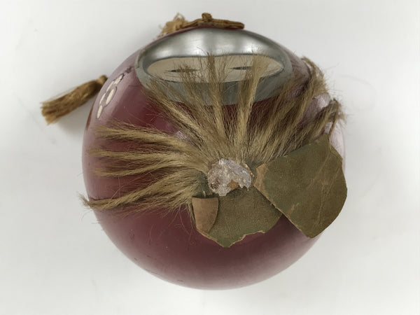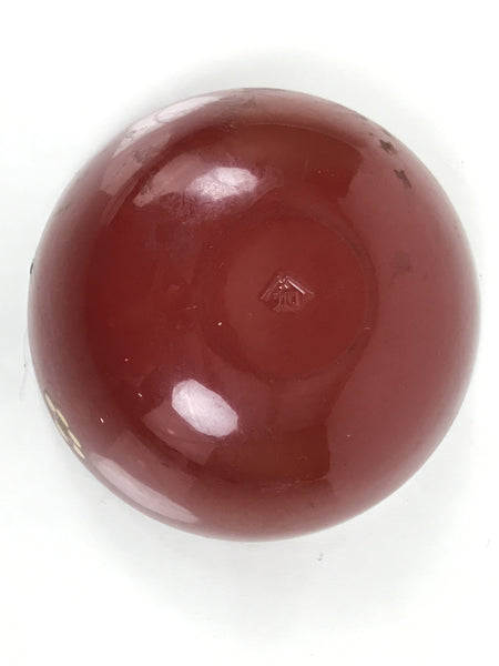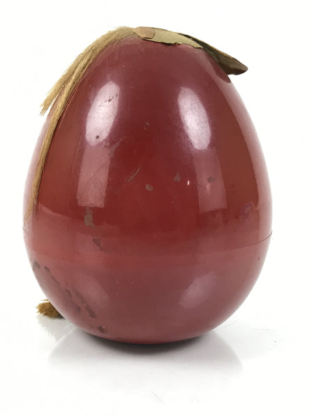 This is a vintage Japanese lacquerware-replica container in the shape of a doll figurine or a Daruma. It features a red round body with a gold floral design. The expression is calm, and gold hair and a gold tassel decorate the head.