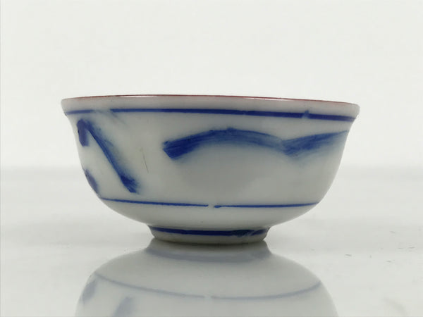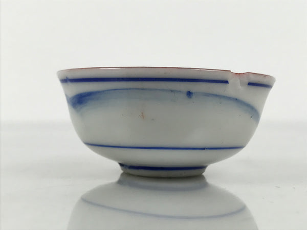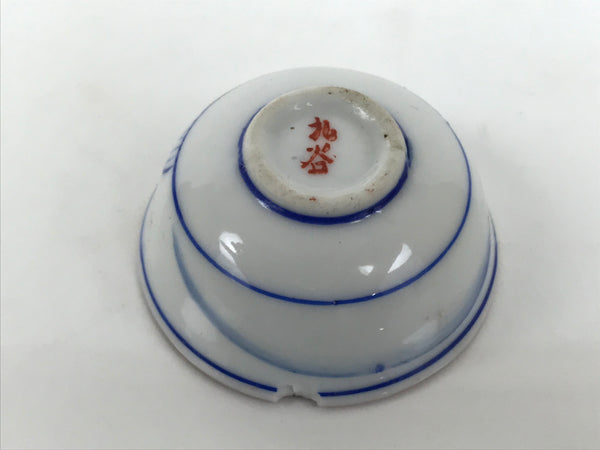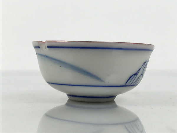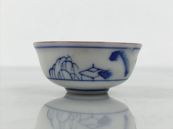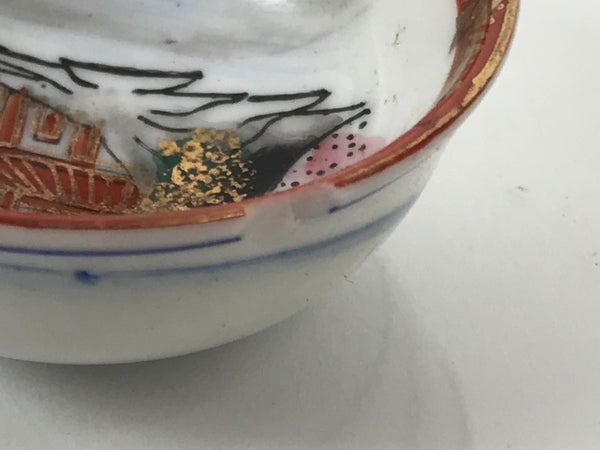 This is a vintage Japanese Kutani porcelain sake cup. This particular type of cup is called tsubomi or "bud type" due to its resemblance to a flower bud. In terms of size, it is also called ochoko. This beautiful imari sake cup is fully decorated with precise gold linework on a red inner rim. The entire design features a temple set behind a mountain. The outside edge is a simplistic sometsuke blue and white design of the same motif. It has the Kutani marking on the bottom.