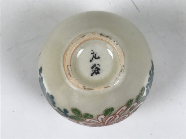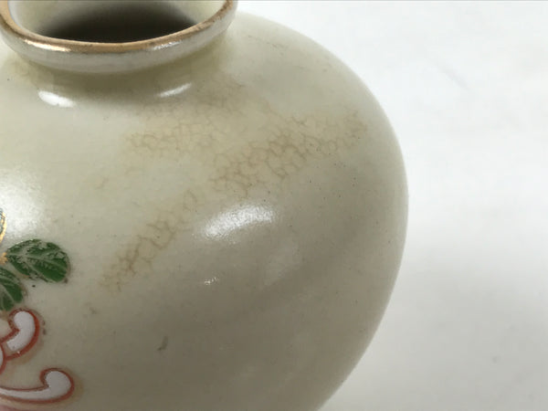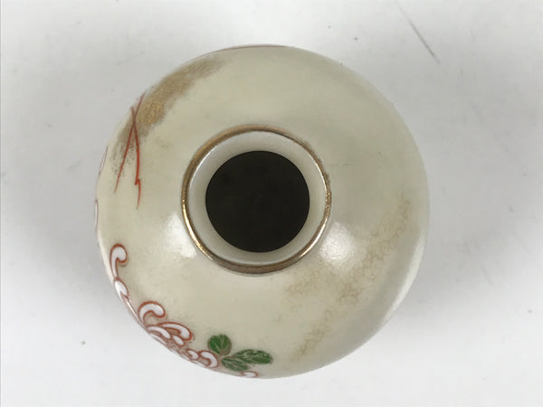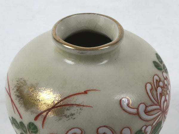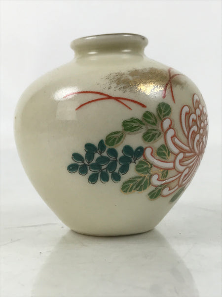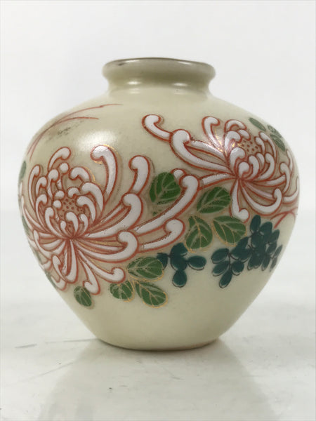 This is a vintage Japanese Kutani ware flower vase, or kabin. This little porcelain vase features beautiful white chrysanthemums with red outlines and green leaves with gold outlines. A signature of Kutani is on the bottom. It is small enough for a single flower (ichirin zashi) or a tiny bouquet.
