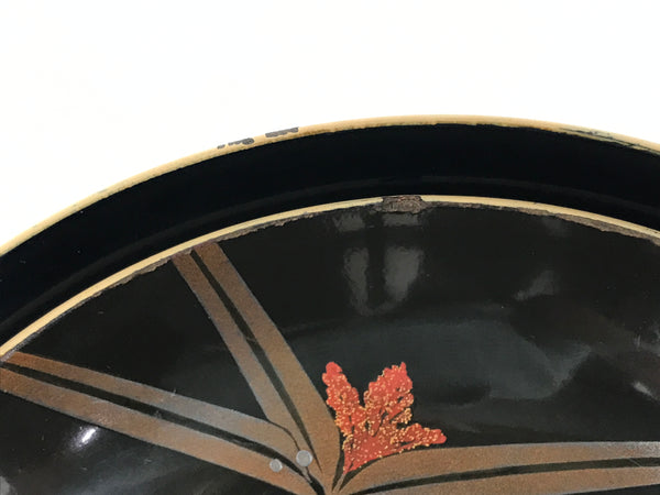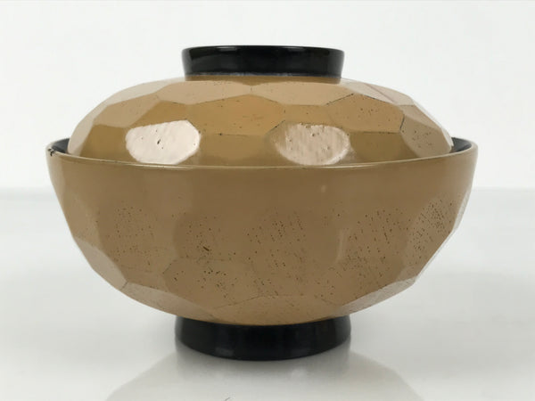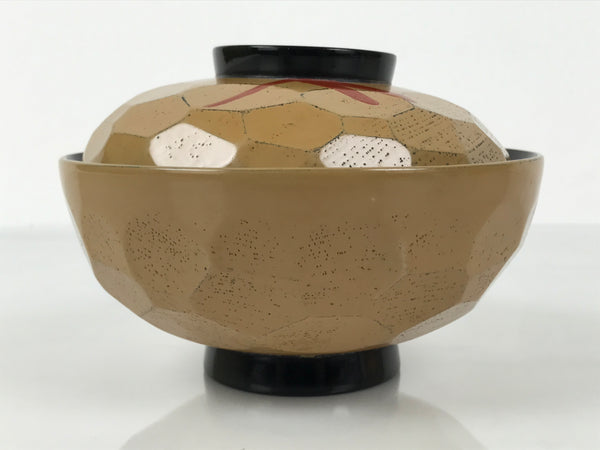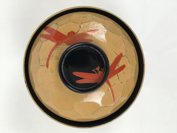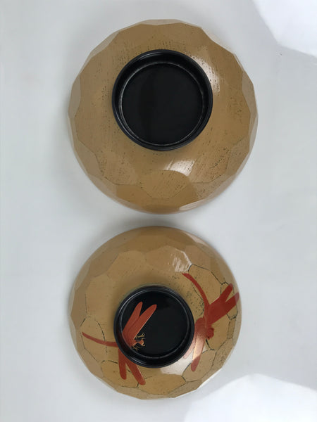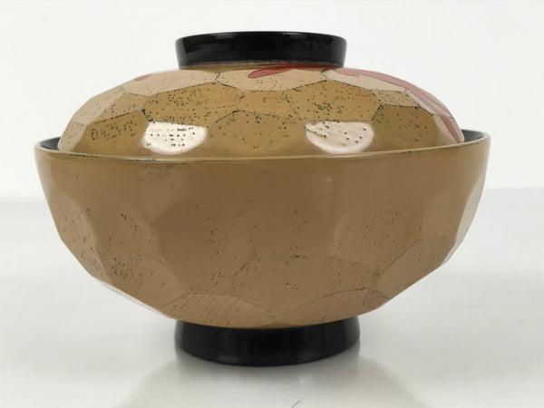 A matte light brown with black on the inside, this vintage lacquered wooden lidded bowl is a beautifully decorative addition to any traditional Japanese dinnerware set. The lid features a red and gold makie design of dragonflies and plants. The outside of the bowl has a very kamakurabori-like style. This particular bowl is considered a owan, a bowl made for rice, soups, or larger side dishes.