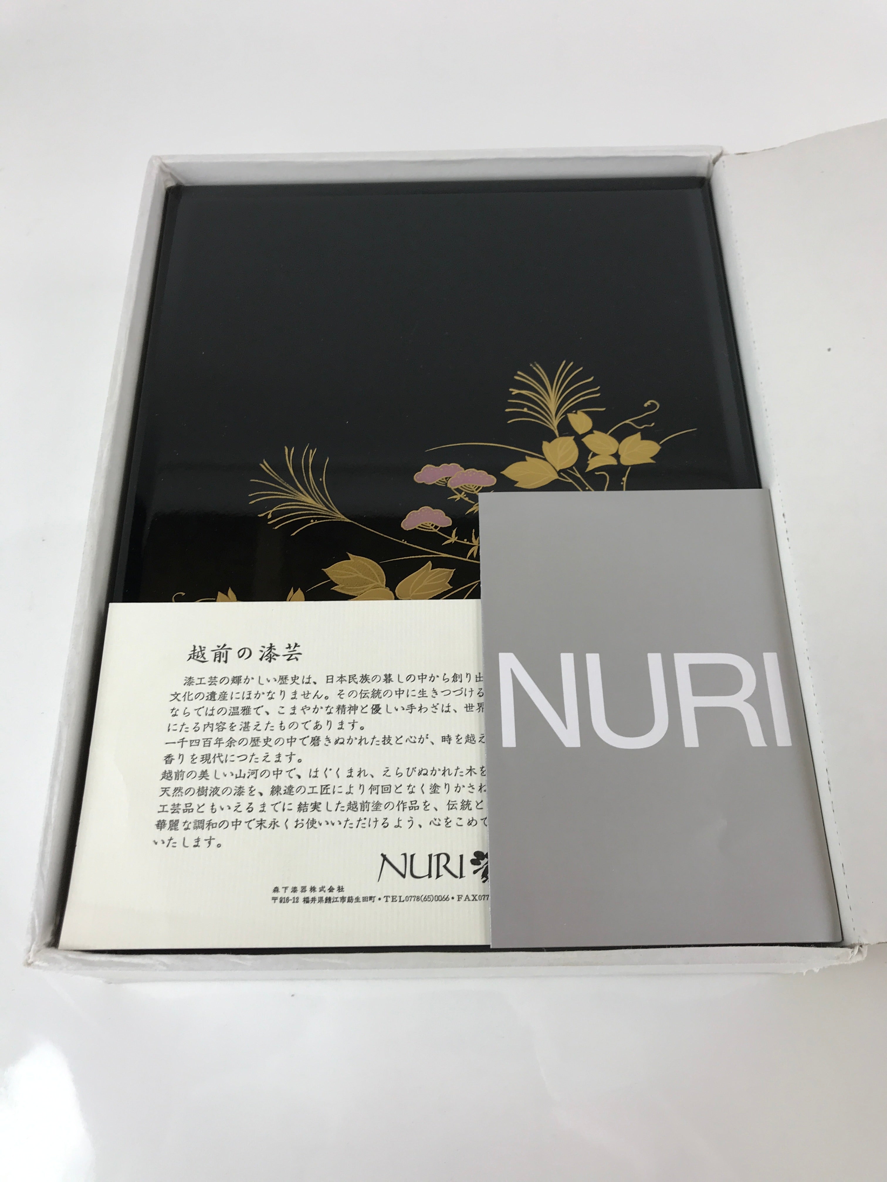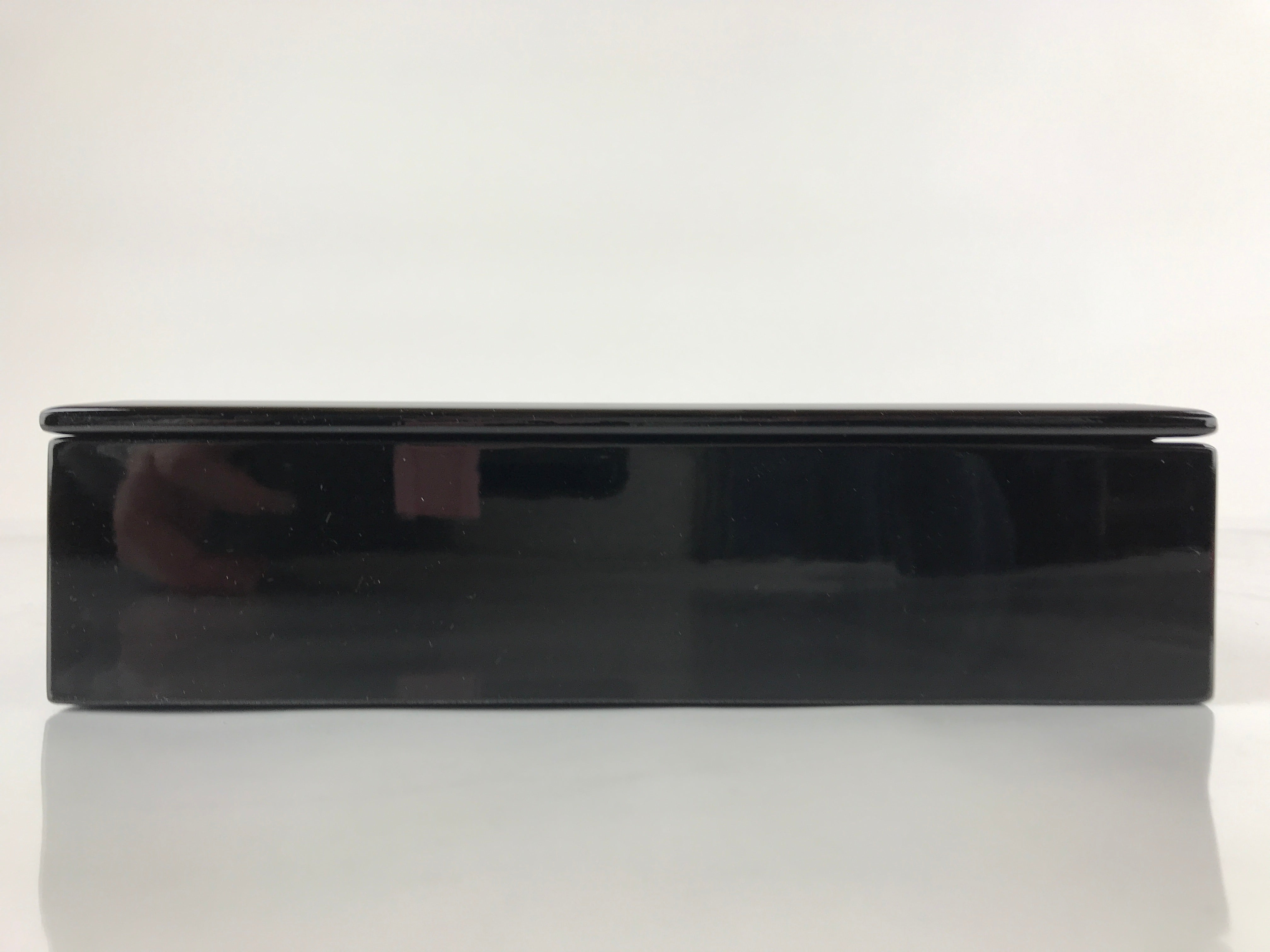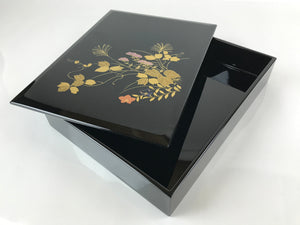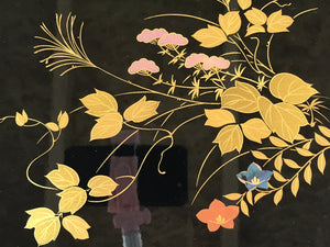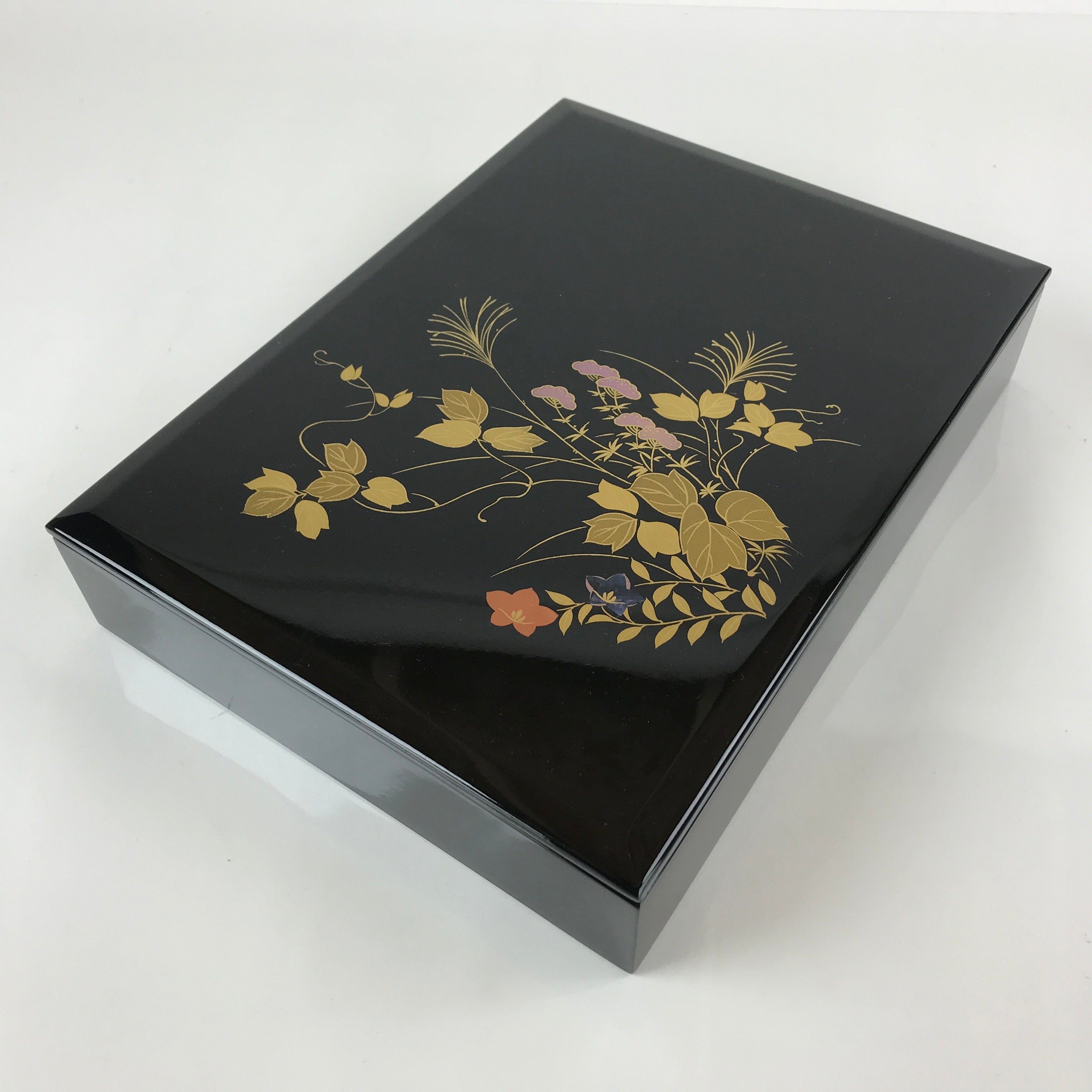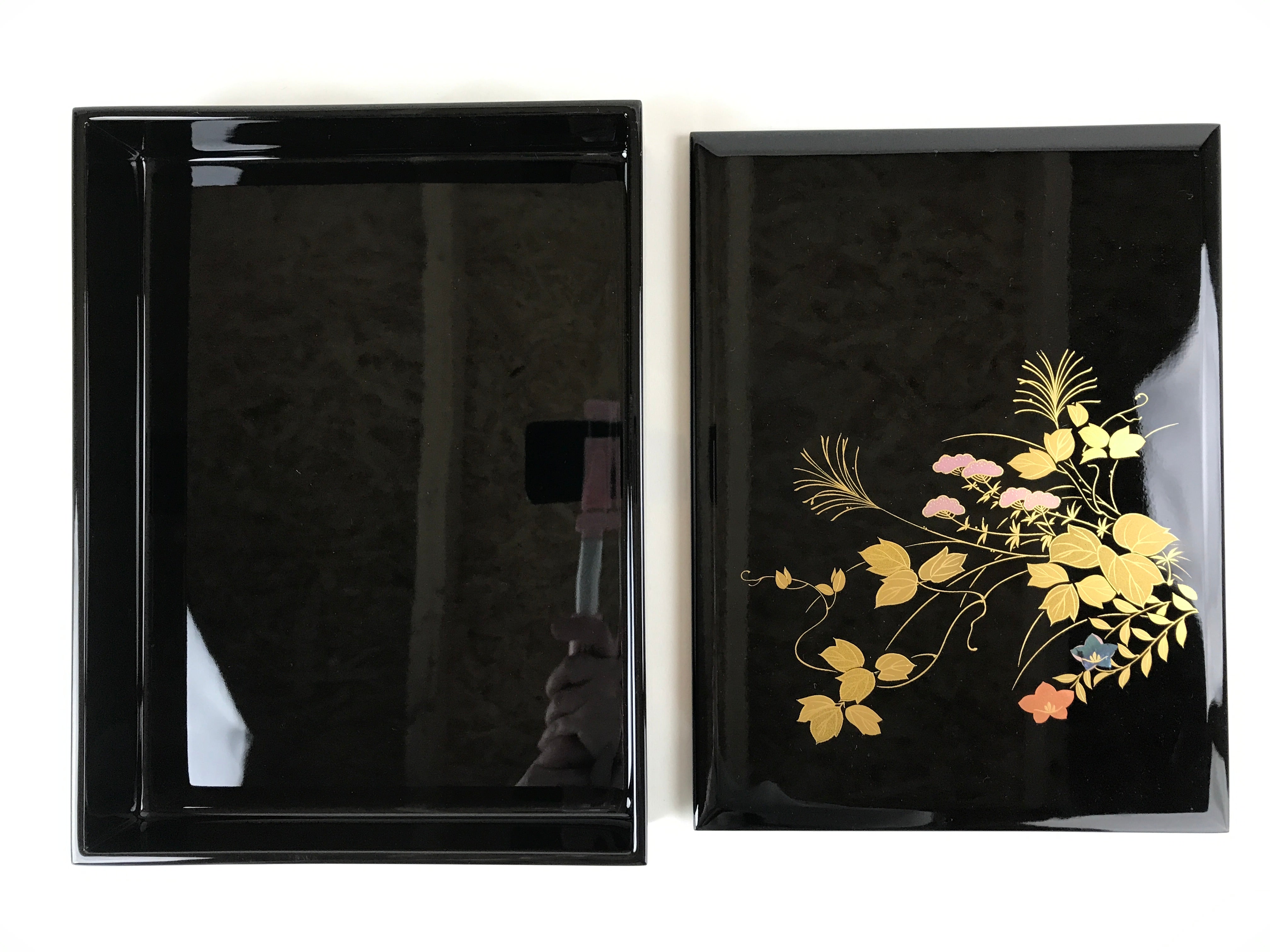 This elegant glossy black lacquer piece is a beautiful decorative and functional addition to any home or office space. It features an elaborate gold floral makie motif with vines, grass, and a few types of flowers. One flower is made with raden (thin slice of abalone nacre). It has a textured bottom. The original box is included and comes with small pamphlets about lacquerware.